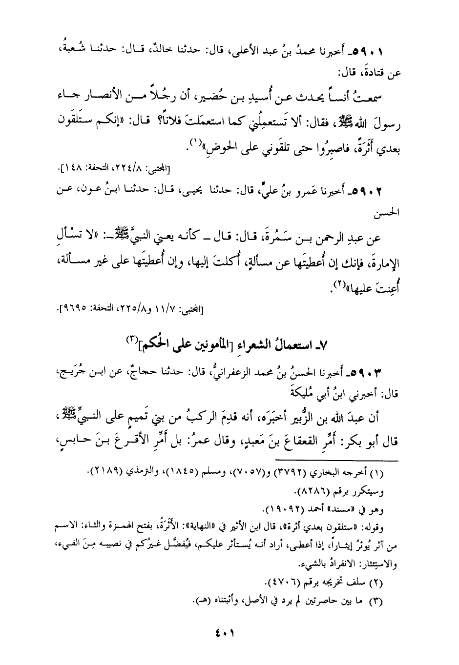 5901 - أَخْبَرَنَا مُحَمَّدُ بْنُ عَبْدِ الْأَعْلَى، قَالَ: حَدَّثَنَا خَالِدٌ، قَالَ: حَدَّثَنَا شُعْبَةُ، عَنْ قَتَادَةَ، قَالَ: سَمِعْتُ أَنَسًا، يُحَدِّثُ عَنْ أُسَيْدِ بْنِ حُضَيْرٍ، أَنَّ رَجُلًا، مِنَ الْأَنْصَارِ جَاءَ رَسُولَ اللهِ صَلَّى اللهُ عَلَيْهِ وَسَلَّمَ، فَقَالَ: أَلَا تَسْتَعْمِلُنِي كَمَا اسْتَعْمَلْتَ فُلَانًا؟، قَالَ: «§إِنَّكُمْ سَتَلْقَوْنَ بَعْدِي أَثَرَةً، فَاصْبِرُوا حَتَّى تَلْقَوْنِي عَلَى الْحَوْضِ»