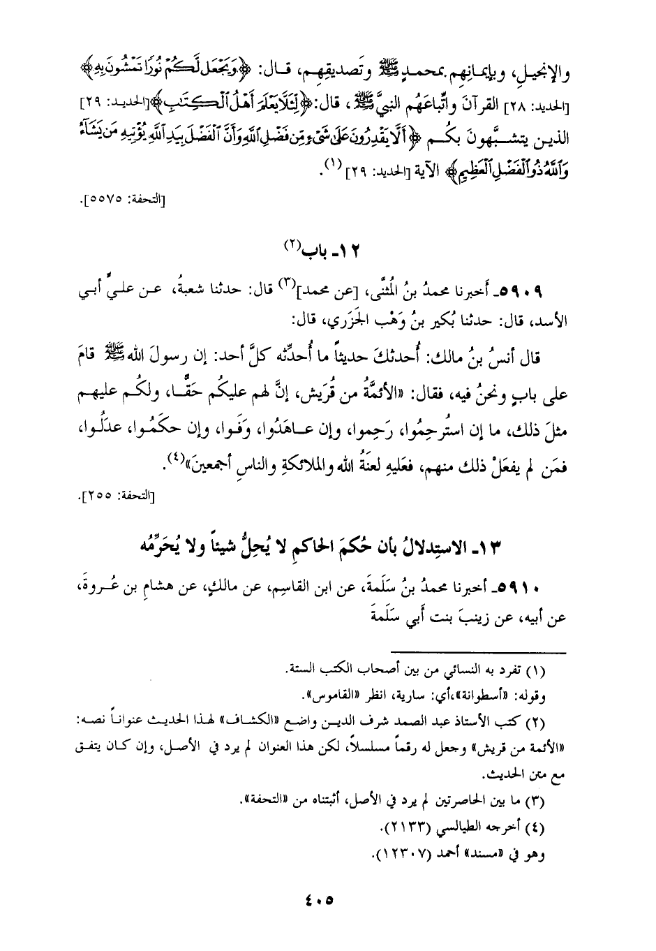 5909 - أَخْبَرَنَا مُحَمَّدُ بْنُ الْمُثَنَّى عَنْ مُحَمَّدٍ، قَالَ: حَدَّثَنَا شُعْبَةُ، عَنْ عَلِيٍّ أَبِي الْأَسْدِ، قَالَ: حَدَّثَنَا بُكَيْرُ بْنُ وَهْبٍ الْجَزَرِيُّ، قَالَ: قَالَ أَنَسُ بْنُ مَالِكٍ: أُحَدِّثُكَ حَدِيثًا مَا أُحَدِّثُهُ كُلَّ أَحَدٍ: إِنَّ رَسُولَ اللهِ صَلَّى اللهُ عَلَيْهِ وَسَلَّمَ قَامَ عَلَى بَابٍ وَنَحْنُ فِيهِ، فَقَالَ: «§الْأَئِمَّةُ مِنْ قُرَيْشٍ، إِنَّ لَهُمْ عَلَيْكُمْ حَقًّا، وَلَكُمْ عَلَيْهِمْ مِثْلُ ذَلِكَ، مَا إِنِ اسْتُرْحِمُوا رَحِمُوا، وَإِنْ عَاهَدُوا وَفَوْا، وَإِنْ حَكَمُوا عَدَلُوا، فَمَنْ لَمْ يَفْعَلْ ذَلِكَ مِنْهُمْ فَعَلَيْهِ لَعْنَةُ اللهِ، وَالْمَلَائِكَةِ، وَالنَّاسِ أَجْمَعِينَ»