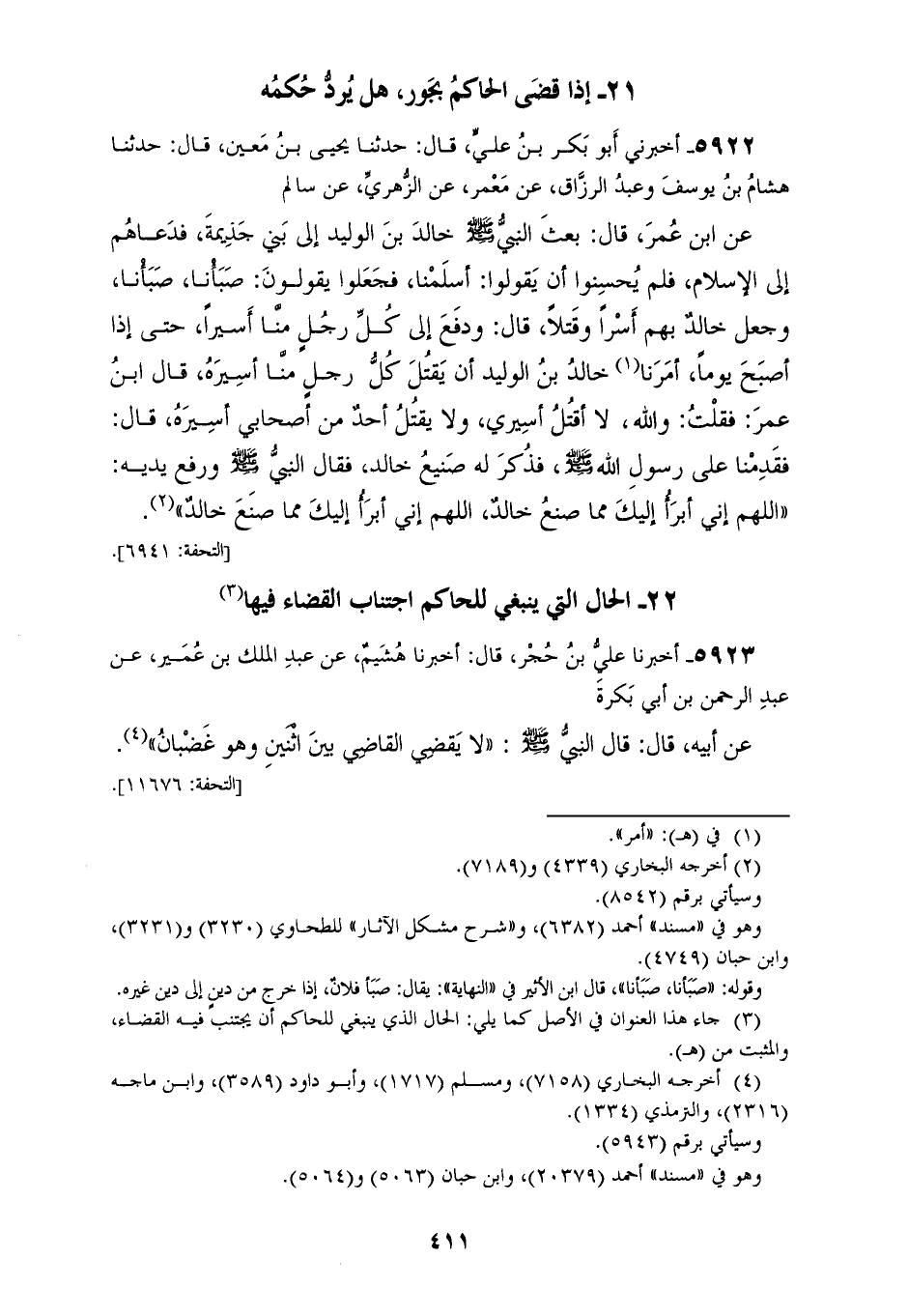 5923 - أَخْبَرَنَا عَلِيُّ بْنُ حُجْرٍ، قَالَ: أَخْبَرَنَا هُشَيْمٌ، عَنْ عَبْدِ الْمَلِكِ بْنِ عُمَيْرٍ، عَنْ عَبْدِ الرَّحْمَنِ بْنِ أَبِي بَكْرَةَ، عَنْ أَبِيهِ، قَالَ: قَالَ النَّبِيُّ صَلَّى اللهُ عَلَيْهِ وَسَلَّمَ: «§لَا يَقْضِي الْقَاضِي بَيْنَ اثْنَيْنِ وَهُوَ غَضْبَانُ»