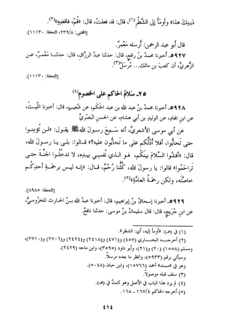 5928 - أَخْبَرَنَا مُحَمَّدُ بْنُ عَبْدِ اللهِ بْنِ عَبْدِ الْحَكَمِ، عَنْ شُعَيْبٍ، قَالَ: أَخْبَرَنَا اللَّيْثُ، عَنِ ابْنِ الْهَادِّ، عَنِ الْوَلِيدِ بْنِ أَبِي هِشَامٍ، عَنِ الْحَسَنِ الْبَصْرِيِّ، عَنْ أَبِي مُوسَى الْأَشْعَرِيِّ أَنَّهُ سَمِعض رَسُولَ اللهِ صَلَّى اللهُ عَلَيْهِ وَسَلَّمَ يَقُولُ: «لَنْ تُؤْمِنُوا حَتَّى تَحَابُّوا أَفَلَّا أَدُلُّكُمْ عَلَى مَا تَحَابُّونَ عَلَيْهِ؟» قَالُوا بَلَى يَا رَسُولَ اللهِ، قَالَ: «§أَفْشُوا السَّلَامَ بَيْنَكُمْ، فَوَالَّذِي نَفْسِي بِيَدِهِ، لَا تَدْخُلُوا الْجَنَّةَ حَتَّى تَرَاحَمُوا» قَالُوا: يَا رَسُولَ اللهِ، كُلُّنَا رَحِمٌ، قَالَ: «إِنَّهُ لَيْسَ بِرَحْمَةِ أَحَدِكُمْ خَاصَّتَهَ، وَلَكِنْ رَحْمَةُ الْعَامَّةِ»