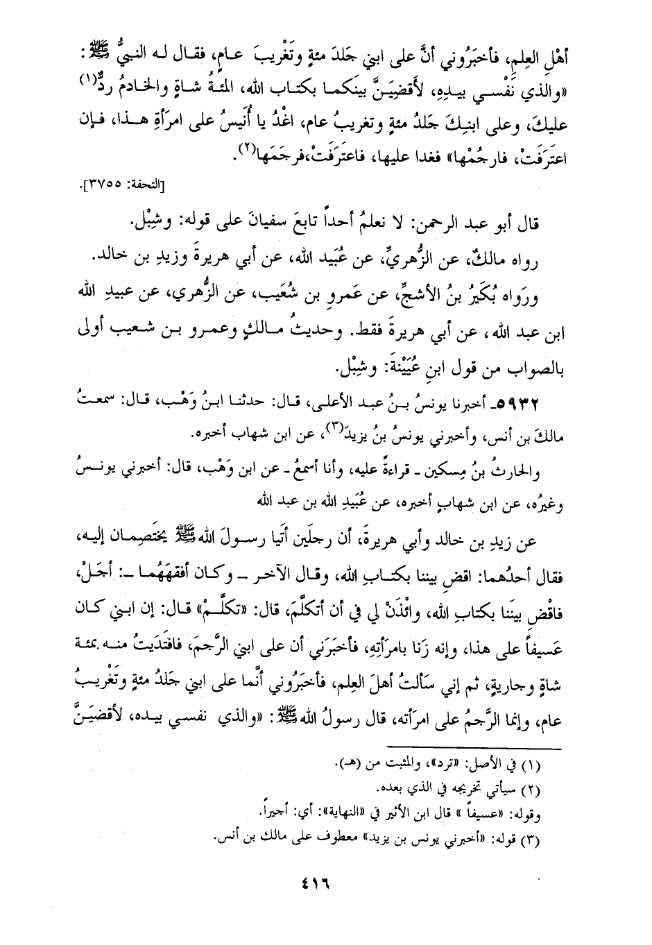 5932 - وَأَخْبَرَنِي يُونُسُ بْنُ يَزِيدَ، عَنِ ابْنِ شِهَابٍ، أَخْبَرَهُ وَالْحَارِثُ بْنُ مِسْكِينٍ، قِرَاءَةً عَلَيْهِ وَأَنَا أَسْمَعُ، عَنِ ابْنِ وَهْبٍ، قَالَ: أَخْبَرَنِي يُونُسُ، وَغَيْرُهُ، عَنِ ابْنِ شِهَابٍ، أَخْبَرَهُ عَنْ عُبَيْدِ اللهِ بْنِ عَبْدِ اللهِ، عَنْ زَيْدِ بْنِ خَالِدٍ، وَأَبِي هُرَيْرَةَ أَنَّ رَجُلَيْنِ، أَتَيَا رَسُولَ اللهِ صَلَّى اللهُ عَلَيْهِ وَسَلَّمَ يَخْتَصِمَانِ إِلَيْهِ، فَقَالَ أَحَدُهُمَا: اقْضِ بَيْنَنَا بِكِتَابِ اللهِ، وَقَالَ الْآخَرُ وَكَانَ أَفْقَهَهُمَا: أَجَلْ فَاقْضِ بَيْنَنَا بِكِتَابِ اللهِ، وَائْذَنْ لِي فِي أَنْ أَتَكَلَّمَ، قَالَ: تَكَلَّمَ قَالَ: إِنَّ ابْنِي كَانَ عَسِيفًا عَلَى هَذَا وَإِنَّهُ زَنَا بِامْرَأَتِهِ، فَأَخْبَرَنِي أَنَّ عَلَى ابْنِي الرَّجْمَ، فَافْتَدَيْتُ مِنْهُ بِمِائَةِ شَاةٍ وَجَارِيَةٍ، ثُمَّ إِنِّي سَأَلْتُ أَهْلَ الْعِلْمِ، فَأَخْبَرُونِي أَنَّمَا عَلَى ابْنِي جَلْدُ مِائَةٍ، وَتَغْرِيبُ عَامٍ وَإِنَّمَا الرَّجْمُ عَلَى امْرَأَتِهِ، قَالَ رَسُولُ اللهِ صَلَّى اللهُ عَلَيْهِ وَسَلَّمَ: «§وَالَّذِي نَفْسِي بِيَدِهِ لَأَقْضِيَنَّ بَيْنَكُمَا بِكِتَابِ اللهِ أَمَّا غَنَمُكَ وَجَارِيَتُكَ فَرُدَّ إِلَيْكَ، وَجَلَدَ ابْنَهُ مِائَةً وَغَرَّبَهُ عَامًا، وَأَمَرَ أُنَيْسًا أَنْ يَرْجُمَ امْرَأَةَ الْآخَرِ إِنِ اعْتَرَفَتْ فَاعْتَرَفَتْ فَرَجَمَهَا»