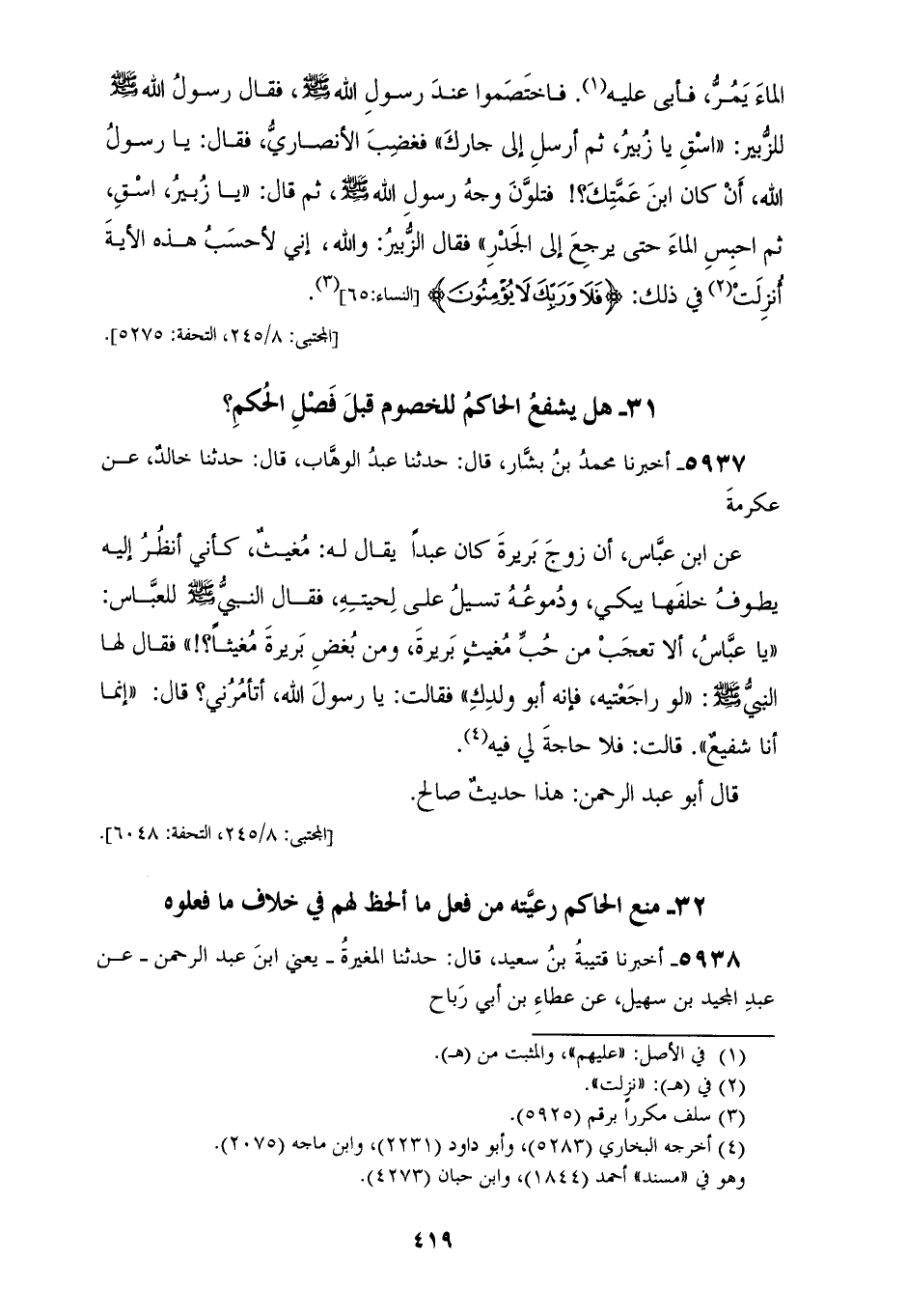 5937 - أَخْبَرَنَا مُحَمَّدُ بْنُ بَشَّارٍ، قَالَ: حَدَّثَنَا عَبْدُ الْوَهَّابِ، قَالَ: حَدَّثَنَا خَالِدٌ، عَنْ عِكْرِمَةَ، عَنِ ابْنِ عَبَّاسٍ، أَنَّ زَوْجَ، بَرِيرَةَ كَانَ عَبْدًا يُقَالُ لَهُ: مُغِيثٌ كَأَنِّي أَنْظُرُ إِلَيْهِ يَطُوفُ خَلْفَهَا يَبْكِي، وَدُمُوعُهُ تَسِيلُ عَلَى لِحْيَتِهِ، فَقَالَ النَّبِيُّ صَلَّى اللهُ عَلَيْهِ وَسَلَّمَ لِلْعَبَّاسِ: «يَا §عَبَّاسُ أَلَا تَعْجَبُ مِنْ حُبِّ مُغِيثٍ بَرِيرَةَ، وَمِنْ بُغْضِ بَرِيرَةَ مُغِيثًا؟»، فَقَالَ لَهَا النَّبِيُّ صَلَّى اللهُ عَلَيْهِ وَسَلَّمَ: «لَوْ رَاجَعْتِيهِ فَإِنَّهُ أَبُو وَلَدِكِ»، فَقَالَتْ: يَا رَسُولَ اللهِ أَتَأْمُرُنِي؟، قَالَ: «إِنَّمَا أَنَا شَفِيعٌ»، قَالَتْ: فَلَا حَاجَةَ لِي فِيهِ، قَالَ أَبُو عَبْدِ الرَّحْمَنِ: هَذَا حَدِيثٌ صَالِحٌ