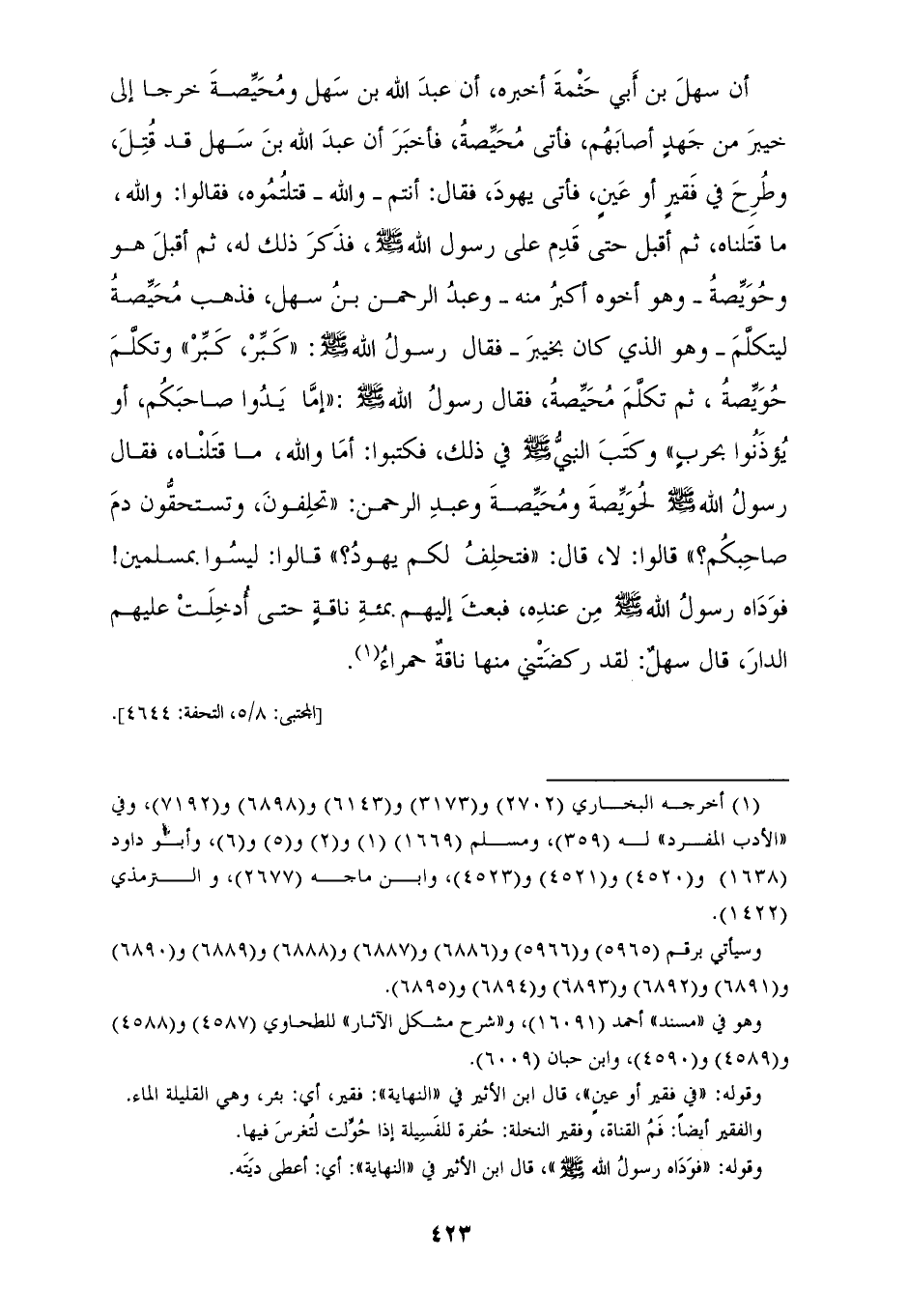 5945 - أَخْبَرَنَا أَحْمَدُ بْنُ عَمْرٍو، قَالَ: أَخْبَرَنَا ابْنُ وَهْبٍ، قَالَ: أَخْبَرَنِي مَالِكُ بْنُ أَنَسٍ، عَنْ أَبِي لَيْلَى بْنِ عَبْدِ اللهِ بْنِ عَبْدِ الرَّحْمَنِ الْأَنْصَارِيِّ، أَنَّ سَهْلَ بْنَ أَبِي حَثْمَةَ أَخْبَرَهُ أَنَّ عَبْدَ اللهِ بْنَ سَهْلٍ، وَمُحَيِّصَةَ خَرَجَا إِلَى خَيْبَرَ مِنْ جَهْدٍ أَصَابَهُمْ، فَأَتَى مُحَيِّصَةُ، فَأُخْبِرَ أَنَّ عَبْدَ اللهِ بْنَ سَهْلٍ قَدْ قُتِلَ وَطُرِحَ فِي فَقِيرٍ أَوْ عَيْنٍ، فَأَتَى يَهُودَ، فَقَالَ: أَنْتُمْ وَاللهِ قَتَلْتُمُوهُ، فَقَالُوا: وَاللهِ مَا قَتَلْنَاهُ، ثُمَّ أَقْبَلَ مَنْ قَدِمَ عَلَى رَسُولِ اللهِ صَلَّى اللهُ عَلَيْهِ وَسَلَّمَ، فَذَكَرَ ذَلِكَ لَهُ، ثُمَّ أَقْبَلَ هُوَ وَحُوَيِّصَةُ، وَهُوَ أَخُوهُ أَكْبَرُ مِنْهُ وَعَبْدُ الرَّحْمَنِ بْنُ سَهْلٍ، فَذَهَبَ مُحَيِّصَةُ لِيَتَكَلَّمَ، وَهُوَ الَّذِي كَانَ بِخَيْبَرَ، فَقَالَ رَسُولُ اللهِ صَلَّى اللهُ عَلَيْهِ وَسَلَّمَ: «§كَبِّرْ كَبِّرْ وَتَكَلَّمَ حُوَيِّصَةُ، ثُمَّ تَكَلَّمَ مُحَيِّصَةُ»، فَقَالَ رَسُولُ اللهِ صَلَّى اللهُ عَلَيْهِ وَسَلَّمَ: «إِمَّا أَنْ يَدُوا صَاحِبَكُمْ أَوْ يُؤْذَنُوا بِحَرْبٍ» وَكَتَبَ النَّبِيُّ صَلَّى اللهُ عَلَيْهِ وَسَلَّمَ فِي ذَلِكَ فَكَتَبُوا، أَمَا وَاللهِ مَا قَتَلْنَاهُ، فَقَالَ رَسُولُ اللهِ صَلَّى اللهُ عَلَيْهِ وَسَلَّمَ: لِحُوَيِّصَةَ وَمُحَيِّصَةَ وَعَبْدِ الرَّحْمَنِ: «تَحْلِفُونَ وَتَسْتَحِقُّونَ دَمَ صَاحِبِكُمْ؟» قَالُوا: لَا قَالَ: «فَتَحْلِفُ لَكُمْ يَهُودُ» قَالُوا: لَيْسُوا بِمُسْلِمِينَ، فَوَدَاهُ رَسُولُ اللهِ صَلَّى اللهُ عَلَيْهِ وَسَلَّمَ مِنْ عِنْدِهِ فَبَعَثَ إِلَيْهِمْ بِمِائَةِ نَاقَةٍ حَتَّى أُدْخِلَتْ عَلَيْهِمُ الدَّارَ، قَالَ سَهْلٌ: لَقَدْ رَكَضَتْنِي مِنْهَا نَاقَةٌ حَمْرَاءُ