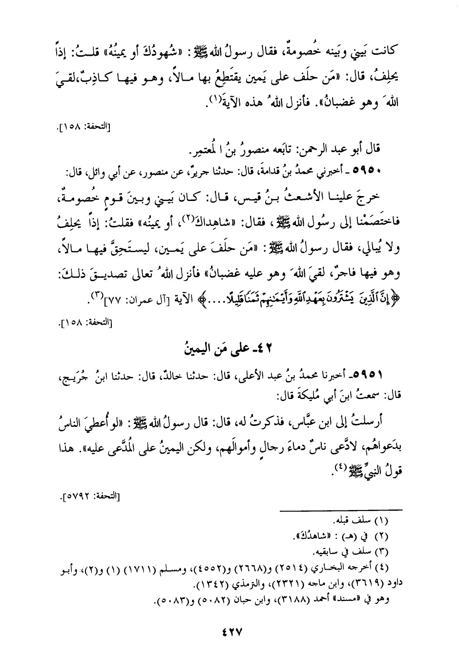 5950 - أَخْبَرَنِي مُحَمَّدُ بْنُ قُدَامَةَ، قَالَ: حَدَّثَنَا جَرِيرٌ، عَنْ مَنْصُورٍ، عَنْ أَبِي وَائِلٍ، قَالَ: خَرَجَ عَلَيْنَا الْأَشْعَثُ بْنُ قَيْسٍ، قَالَ: كَانَ بَيْنِي وَبَيْنَ قَوْمٍ خُصُومَةٌ فَاخْتَصَمْنَا إِلَى رَسُولِ اللهِ صَلَّى اللهُ عَلَيْهِ وَسَلَّمَ، فَقَالَ: شَاهِدَاكَ أَوْ يَمِينُهُ، فَقُلْتُ: إِذًا يَحْلِفُ وَلَا يُبَالِي، فَقَالَ رَسُولُ اللهِ صَلَّى اللهُ عَلَيْهِ وَسَلَّمَ: «§مَنْ حَلَفَ عَلَى يَمِينٍ لِيَسْتَحِقَّ فِيهَا مَالًا، وَهُوَ فِيهَا فَاجِرٌ لَقِيَ اللهَ وَهُوَ عَلَيْهِ غَضْبَانُ» فَأَنْزَلَ اللهُ تَعَالَى تَصْدِيقَ ذَلِكَ {إِنَّ الَّذِينَ يَشْتَرُونَ بِعَهْدِ اللهِ وَأَيْمَانِهِمْ ثَمَنًا قَلِيلًا} [آل عمران: 77] الْآيَةَ