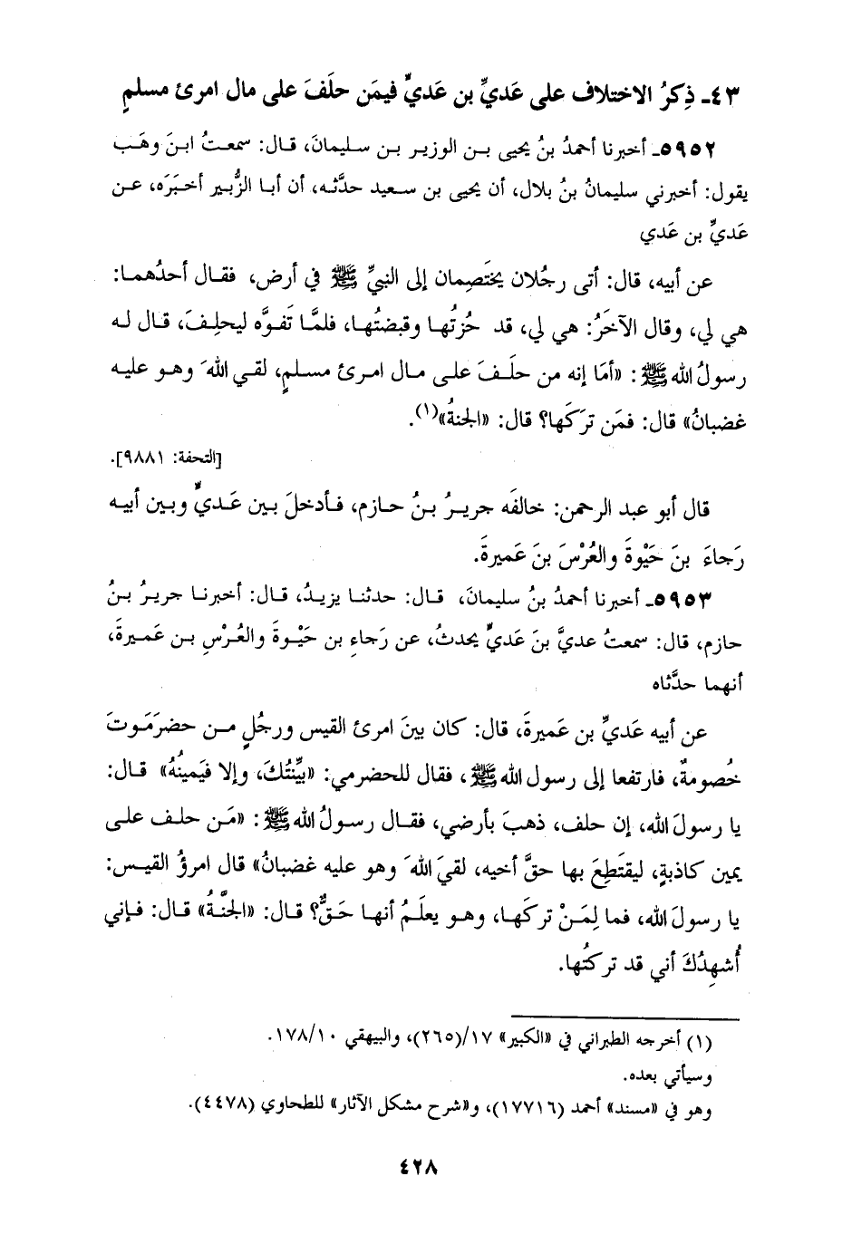 5952 - أَخْبَرَنَا أَحْمَدُ بْنُ يَحْيَى بْنِ الْوَزِيرِ بْنِ سُلَيْمَانَ، قَالَ: سَمِعْتُ ابْنَ وَهْبٍ، يَقُولُ: أَخْبَرَنِي سُلَيْمَانُ بْنُ بِلَالٍ، أَنَّ يَحْيَى بْنَ سَعِيدٍ، حَدَّثَهُ أَنَّ أَبَا الزُّبَيْرِ أَخْبَرَهُ عَنْ عَدِيِّ بْنِ عَدِيٍّ، عَنْ أَبِيهِ، قَالَ: أَتَى رَجُلَانِ يَخْتَصِمَانِ إِلَى النَّبِيِّ صَلَّى اللهُ عَلَيْهِ وَسَلَّمَ فِي أَرْضٍ، فَقَالَ أَحَدُهُمَا: هِيَ لِي، وَقَالَ الْآخَرُ: هِيَ لِي قَدْ حُزْتُهَا وَقَبَضْتُهَا فَلَمَّا تَفَوَّهَ لِيَحْلِفَ، قَالَ لَهُ رَسُولُ اللهِ صَلَّى اللهُ عَلَيْهِ وَسَلَّمَ: «§أَمَا إِنَّهُ مَنْ حَلَفَ عَلَى مَالِ امْرِئٍ مُسْلِمٍ لَقِيَ اللهَ، وَهُوَ عَلَيْهِ غَضْبَانُ»، قَالَ: فَمَنْ تَرَكَهَا، قَالَ: الْجَنَّةُ قَالَ أَبُو عَبْدِ الرَّحْمَنِ: خَالَفَهُ جَرِيرُ بْنُ حَازِمٍ، فَأَدْخَلَ بَيْنَ عَدِيٍّ، وَبَيْنَ أَبِيهِ رَجَاءَ بْنَ حَيْوَةَ وَالْعُرْسَ بْنَ عَمِيرَةَ