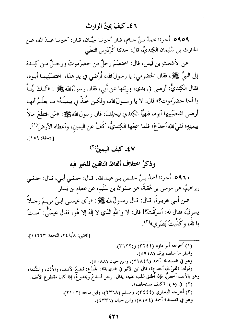 5959 - أَخْبَرَنَا مُحَمَّدُ بْنُ حَاتِمٍ، قَالَ: أَخْبَرَنَا حَبَّانُ، قَالَ: أَخْبَرَنَا عَبْدُ اللهِ، عَنِ الْحَارِثِ بْنِ سُلَيْمَانَ الْكِنْدِيِّ، قَالَ: حَدَّثَنَا كُرْدُوسُ الثَّعْلَبِيُّ، عَنِ الْأَشْعَثِ بْنِ قَيْسٍ، قَالَ: اخْتَصَمَ رَجُلٌ مِنْ حَضْرَمَوْتَ، وَرَجُلٌ مِنْ كِنْدَةَ إِلَى النَّبِيِّ صَلَّى اللهُ عَلَيْهِ وَسَلَّمَ، فَقَالَ الْحَضْرَمِيُّ: يَا رَسُولَ اللهِ أَرْضِي فِي يَدِ هَذَا اغْتَصَبَنِيهَا أَبُوهُ، فَقَالَ الْكِنْدِيُّ: أَرْضِي فِي يَدِي، وَرِثْتُهَا عَنْ أَبِي، فَقَالَ رَسُولُ اللهِ صَلَّى اللهُ عَلَيْهِ وَسَلَّمَ: «§أَلَكَ بَيِّنَةٌ يَا أَخَا حَضْرَمَوْتَ؟»، قَالَ: لَا يَا رَسُولَ اللهِ وَلَكِنْ خُذْ لِي بِيَمِينِهِ مَا يَعْلَمُ أَنَّهَا أَرْضِي اغْتَصَبَنِيهَا أَبُوهُ فَتَهَيَّأَ الْكِنْدِيُّ لِيَحْلِفَ، قَالَ رَسُولُ اللهِ صَلَّى اللهُ عَلَيْهِ وَسَلَّمَ: «مَنِ اقْتَطَعَ مَالًا بِيَمِينِهِ لَقِيَ اللهَ أَجْدَعَ» فَلَمَّا سَمِعَهَا الْكِنْدِيُّ كَفَّ عَنِ الْيَمِينِ وَأَعْطَاهُ الْأَرْضَ