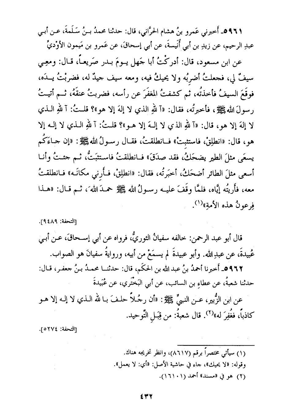 5961 - أَخْبَرَنِي عَمْرُو بْنُ هِشَامٍ الْحَرَّانِيُّ، قَالَ: حَدَّثَنَا مُحَمَّدُ بْنُ سَلَمَةَ، عَنْ أَبِي عَبْدِ الرَّحِيمِ، عَنْ زَيْدِ بْنِ أَبِي أُنَيْسَةَ، عَنْ أَبِي إِسْحَاقَ، عَنْ عَمْرِو بْنِ مَيْمُونٍ الْأَوْدِيِّ، عَنِ ابْنِ مَسْعُودٍ، قَالَ: أَدْرَكْتُ أَبَا جَهْلٍ يَوْمَ بَدْرٍ صَرِيعًا، قَالَ: وَمَعِي سَيْفٌ لِي فَجَعَلْتُ أَضْرِبُهُ، وَلَا يُحَيِّكُ فِيهِ وَمَعَهُ سَيْفٌ لَهُ فَضَرَبْتُ يَدَهُ، فَوَقَعَ السَّيْفُ فَأَخَذْتُهُ ثُمَّ كَشَفْتُ الْمِغْفَرَ عَنْ رَأْسِهِ فَضَرَبْتُ عُنُقَهُ، ثُمَّ أَتَيْتُ رَسُولَ اللهِ صَلَّى اللهُ عَلَيْهِ وَسَلَّمَ فَأَخْبَرْتُهُ، فَقَالَ: «§آللَّهِ الَّذِي لَا إِلَهَ إِلَّا هُوَ»، قُلْتُ: آللَّهِ الَّذِي لَا إِلَهَ إِلَّا هُوَ، قَالَ: «آللَّهِ الَّذِي لَا إِلَهَ إِلَّا هُوَ»، قُلْتُ: آللَّهِ الَّذِي لَا إِلَهَ إِلَّا هُوَ، قَالَ: انْطَلِقْ فَاسْتَثْبِتْ فَانْطَلَقْتُ، فَقَالَ رَسُولُ اللهِ صَلَّى اللهُ عَلَيْهِ وَسَلَّمَ: «إِنْ جَاءَكُمْ يَسْعَى مِثْلَ الطَّيْرِ يَضْحَكُ فَقَدْ صَدَقَ»، فَانْطَلَقْتُ فَاسْتَثْبَتُّ ثُمَّ جِئْتُ وَأَنَا أَسْعَى مِثْلَ الطَّائِرِ أَضْحَكُ، أَخْبَرْتُهُ، فَقَالَ: انْطَلِقْ فَأَرِنِي مَكَانَهُ فَانْطَلَقْتُ مَعَهُ فَأَرَيْتُهُ إِيَّاهُ، فَلَمَّا وَقَفَ عَلَيْهِ رَسُولُ اللهِ صَلَّى اللهُ عَلَيْهِ وَسَلَّمَ حَمِدَ اللهَ، ثُمَّ قَالَ: «هَذَا فِرْعَوْنُ هَذِهِ الْأُمَّةُ» قَالَ أَبُو عَبْدِ الرَّحْمَنِ: خَالَفَهُ سُفْيَانُ الثَّوْرِيُّ، فَرَوَاهُ عَنْ أَبِي إِسْحَاقَ، عَنْ أَبِي عُبَيْدَةَ، عَنْ عَبْدِ اللهِ، وَأَبُو عُبَيْدَةَ لَمْ يَسْمَعْ مِنْ أَبِيهِ، وَرِوَايَةُ سُفْيَانَ هِيَ الصَّوَابُ