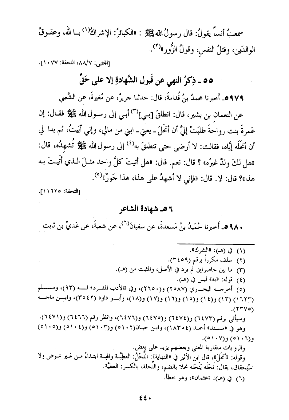 5979 - أَخْبَرَنَا مُحَمَّدُ بْنُ قُدَامَةَ، قَالَ: حَدَّثَنَا جَرِيرٌ، عَنْ مُغِيرَةَ، عَنِ الشَّعْبِيِّ، عَنِ النُّعْمَانِ بْنِ بَشِيرٍ، قَالَ: انْطَلَقَ بِي أَبِي إِلَى رَسُولِ اللهِ صَلَّى اللهُ عَلَيْهِ وَسَلَّمَ، فَقَالَ: إِنَّ عَمْرَةَ بِنْتَ رَوَاحَةَ طَلَبَتْ إِلَيَّ أَنْ أَنْحَلَ - يَعْنِي ابْنِي - مِنْ مَالِي، وَإِنِّي أَبَيْتُ، ثُمَّ بَدَا لِي أَنْ أَنْحَلَهُ إِيَّاهُ، فَقَالَتْ: لَا أَرْضَى حَتَّى تَنْطَلِقَ بِهِ إِلَى رَسُولِ اللهِ صَلَّى اللهُ عَلَيْهِ وَسَلَّمَ تُشْهِدُهُ، قَالَ: «§هَلْ لَكَ وَلَدٌ غَيْرَهُ؟»، قَالَ: نَعَمْ، قَالَ: «هَلْ أَتَيْتَ كُلَّ وَاحِدٍ مِثْلَ الَّذِي أَتَيْتَ بهِ هَذَا؟»، قَالَ: لَا، قَالَ: «فَإِنِّي لَا أَشْهَدُ عَلَى هَذَا، هَذَا جَوْرٌ»