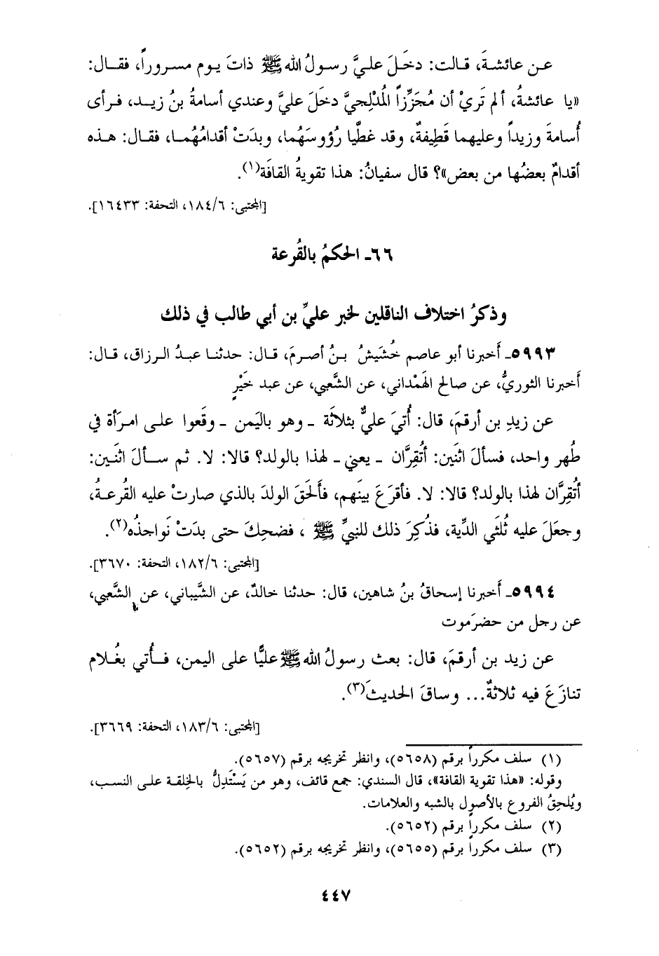 5992 - أَخْبَرَنَا إِسْحَاقُ بْنُ إِبْرَاهِيمَ، قَالَ: أَخْبَرَنَا سُفْيَانُ، وَهُوَ ابْنُ عُيَيْنَةَ، عَنِ الزُّهْرِيِّ، عَنْ عُرْوَةَ، عَنْ عَائِشَةَ، قَالَتْ: دَخَلَ عَلَيَّ رَسُولُ اللهِ صَلَّى اللهُ عَلَيْهِ وَسَلَّمَ ذَاتَ يَوْمٍ مَسْرُورًا، فَقَالَ: «يَا §عَائِشَةُ أَلَمْ تَرَيْ أَنَّ مُجَزِّزًا الْمُدْلِجِيَّ دَخَلَ عَلَيَّ، وَعِنْدِي أُسَامَةُ بْنُ زَيْدٍ فَرَأَى أُسَامَةَ، وَزَيْدًا وَعَلَيْهِمَا قَطِيفَةٌ وَقَدْ غَطَّيَا رُءُوسَهُمَا وَبَدَتْ أَقْدَامُهُمَا؟»، فَقَالَ: هَذِهِ أَقْدَامٌ بَعْضُهَا مِنْ بَعْضٍ، قَالَ سُفْيَانُ: هَذَا تَقْوِيَةُ الْقَافَةِ