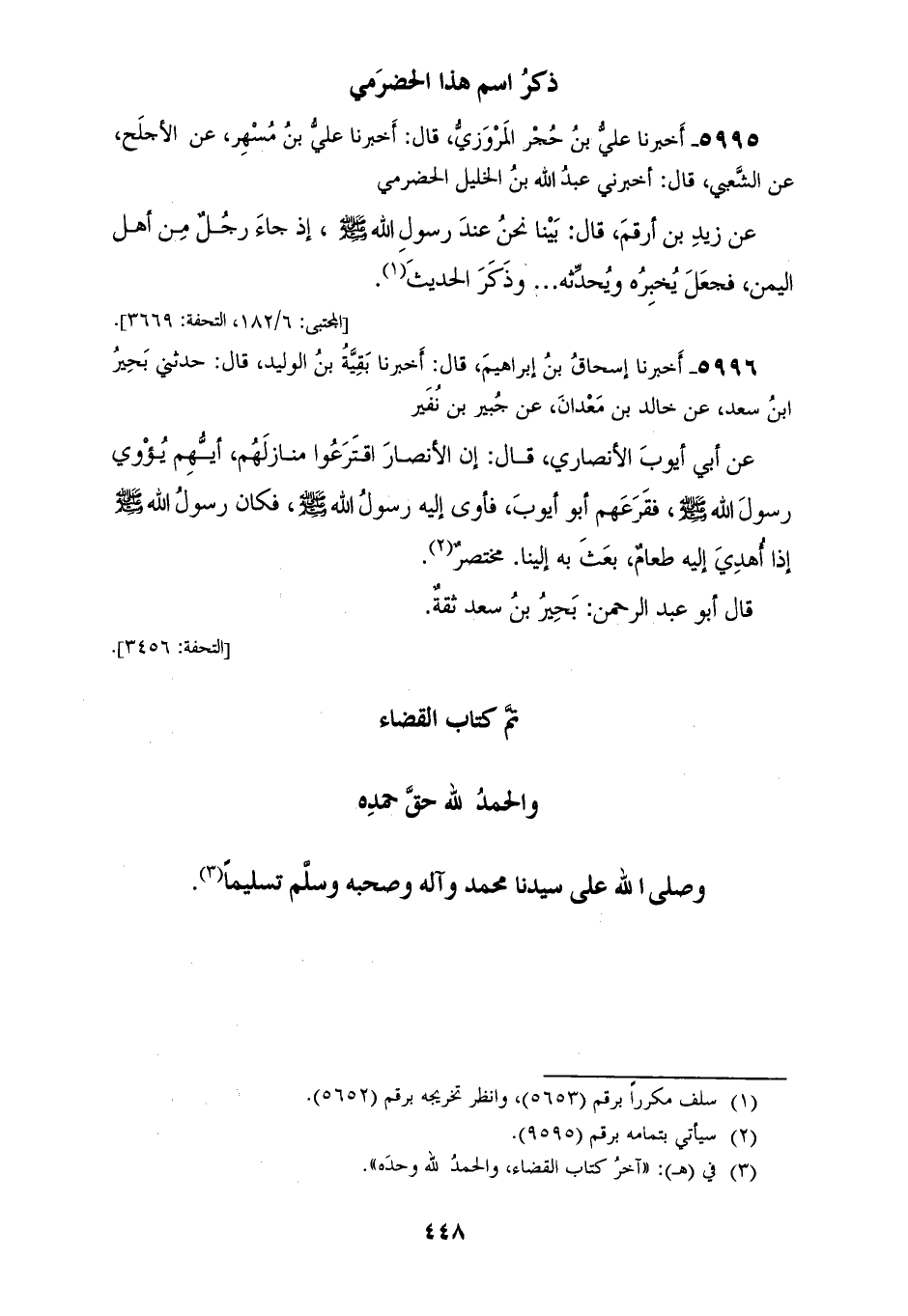 5995 - أَخْبَرَنَا عَلِيُّ بْنُ حُجْرٍ الْمَرْوَزِيُّ، قَالَ: أَخْبَرَنَا عَلِيُّ بْنُ مُسْهِرٍ، عَنِ الْأَجْلَحِ، عَنِ الشَّعْبِيِّ، قَالَ: أَخْبَرَنِي عَبْدُ اللهِ بْنُ الْخَلِيلِ الْحَضْرَمِيُّ، عَنْ زَيْدِ بْنِ أَرْقَمَ، قَالَ: بَيْنَا نَحْنُ عِنْدَ رَسُولِ اللهِ صَلَّى اللهُ عَلَيْهِ وَسَلَّمَ إِذْ §جَاءَ رَجُلٌ مِنْ أَهْلِ الْيَمَنِ فَجَعَلَ يُخْبِرُهُ وَيُحَدِّثُهُ "، وَذَكَرَ الْحَدِيثَ