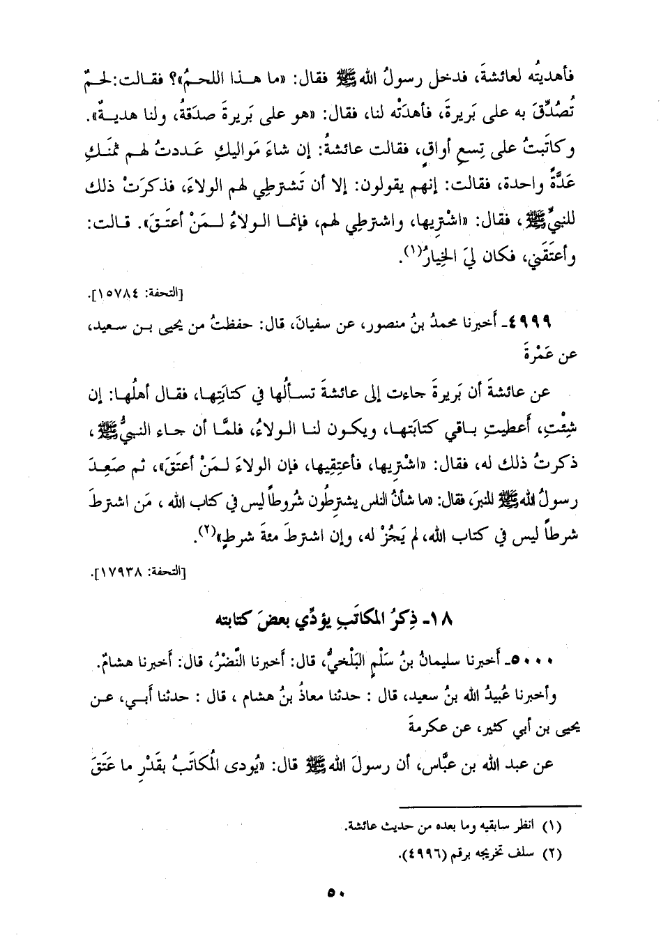 4999 - أَخْبَرَنَا مُحَمَّدُ بْنُ مَنْصُورٍ، عَنْ سُفْيَانَ، قَالَ: حَفِظْتُ مِنْ يَحْيَى بْنِ سَعِيدٍ عَنْ عَمْرَةَ، عَنْ عَائِشَةَ، أَنَّ بَرِيرَةَ، جَاءَتْ إِلَى عَائِشَةَ تَسْأَلُهَا فِي كِتَابَتِهَا، فَقَالَ أَهْلُهَا: إِنْ شِئْتِ أُعْطِيتِ بَاقِيَ كِتَابَتِهَا وَيَكُونُ لَنَا الْوَلَاءُ، فَلَمَّا أَنْ جَاءَ النَّبِيُّ صَلَّى اللهُ عَلَيْهِ وَسَلَّمَ ذَكَرَتْ ذَلِكَ لَهُ، فَقَالَ: " §اشْتَرِيهَا فَأَعْتِقِيهَا، فَإِنَّ الْوَلَاءَ لِمَنْ أَعْتَقَ ثُمَّ صَعِدَ رَسُولُ اللهِ صَلَّى اللهُ عَلَيْهِ وَسَلَّمَ الْمِنْبَرَ، فَقَالَ: «مَا شَأْنُ النَّاسِ يَشْتَرِطُونَ شُرُوطًا لَيْسَ فِي كِتَابِ اللهِ، مَنِ اشْتَرَطَ شَرْطًا لَيْسَ فِي كِتَابِ اللهِ لَمْ يَجُزْ لَهُ، وَإِنِ اشْتَرَطَ مِائَةَ شَرْطٍ»