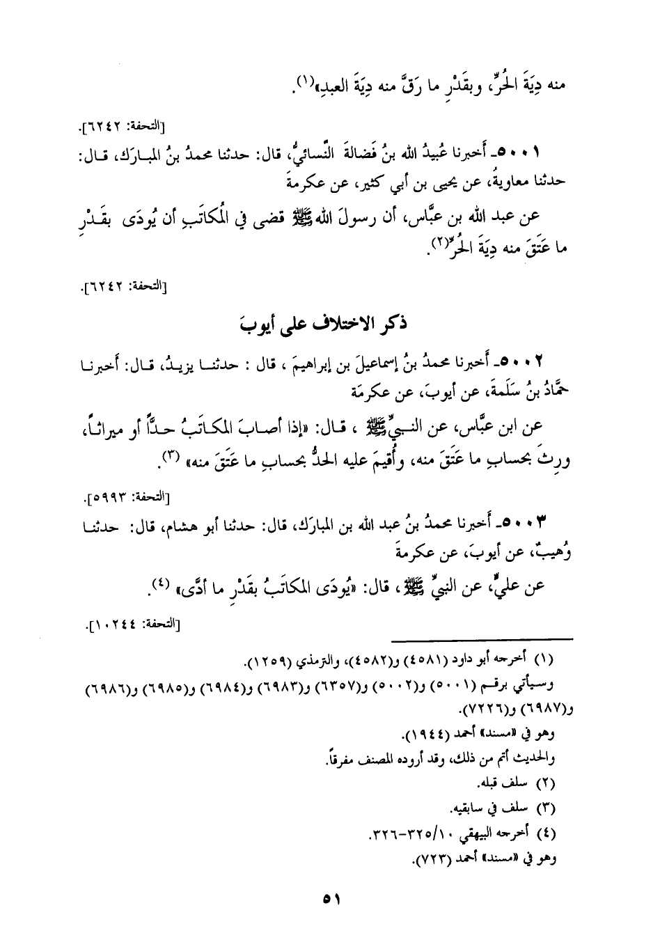 5002 - أَخْبَرَنَا مُحَمَّدُ بْنُ إِسْمَاعِيلَ بْنِ إِبْرَاهِيمَ، قَالَ: حَدَّثَنَا يَزِيدُ، قَالَ: أَخْبَرَنَا حَمَّادُ بْنُ سَلَمَةَ، عَنْ أَيُّوبَ، عَنْ عِكْرِمَةَ، عَنِ ابْنِ عَبَّاسٍ، عَنِ النَّبِيِّ صَلَّى اللهُ عَلَيْهِ وَسَلَّمَ قَالَ: «§إِذَا أَصَابَ الْمُكَاتَبُ حَدًّا أَوْ مِيرَاثًا، وَرِثَ بِحِسَابِ مَا عَتَقَ مِنْهُ، وَأُقِيمَ عَلَيْهِ الْحَدُّ بِحِسَابِ مَا عَتَقَ مِنْهُ»