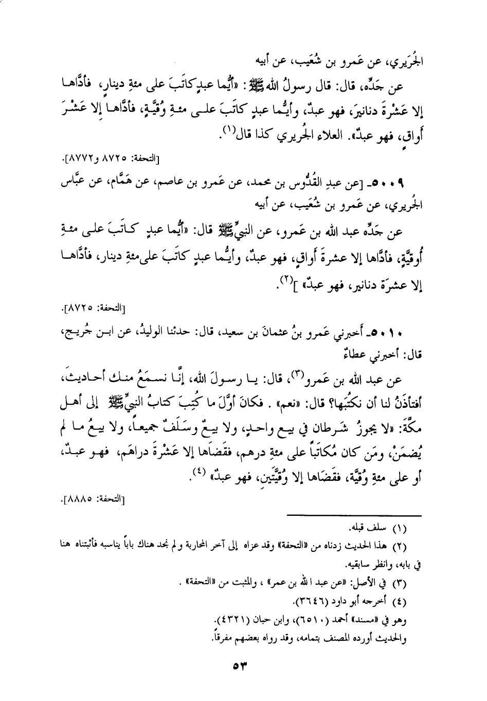 5009 - عَنْ عَبْدِ الْقُدُّوسِ بْنِ مُحَمَّدٍ، عَنْ عَمْرِو بْنِ عَاصِمٍ، عَنْ هَمَّامٍ، عَنْ عَبَّاسٍ الْجُرَيْرِيِّ، عَنْ عَمْرِو بْنِ شُعَيْبٍ، عَنْ أَبِيهِ، عَنْ جَدِّهِ عَبْدِ اللهِ بْنِ عَمْرٍو، عَنِ النَّبِيِّ صَلَّى اللهُ عَلَيْهِ وَسَلَّمَ قَالَ: §أَيُّمَا عَبْدٍ كَاتَبَ عَلَى مِئَةِ أُوقِيَّةٍ، فَأَدَّاهَا إِلَّا عَشْرَةَ أَوَاقٍ فَهُوَ عَبْدٌ، وَأَيُّمَا عَبْدٍ كَاتَبَ عَلَى مِئَةِ دِينَارٍ فَأَدَّاهَا، إِلَّا عَشْرَةَ دَنَانِيرٍ، فَهُوَ عَبْدٌ "