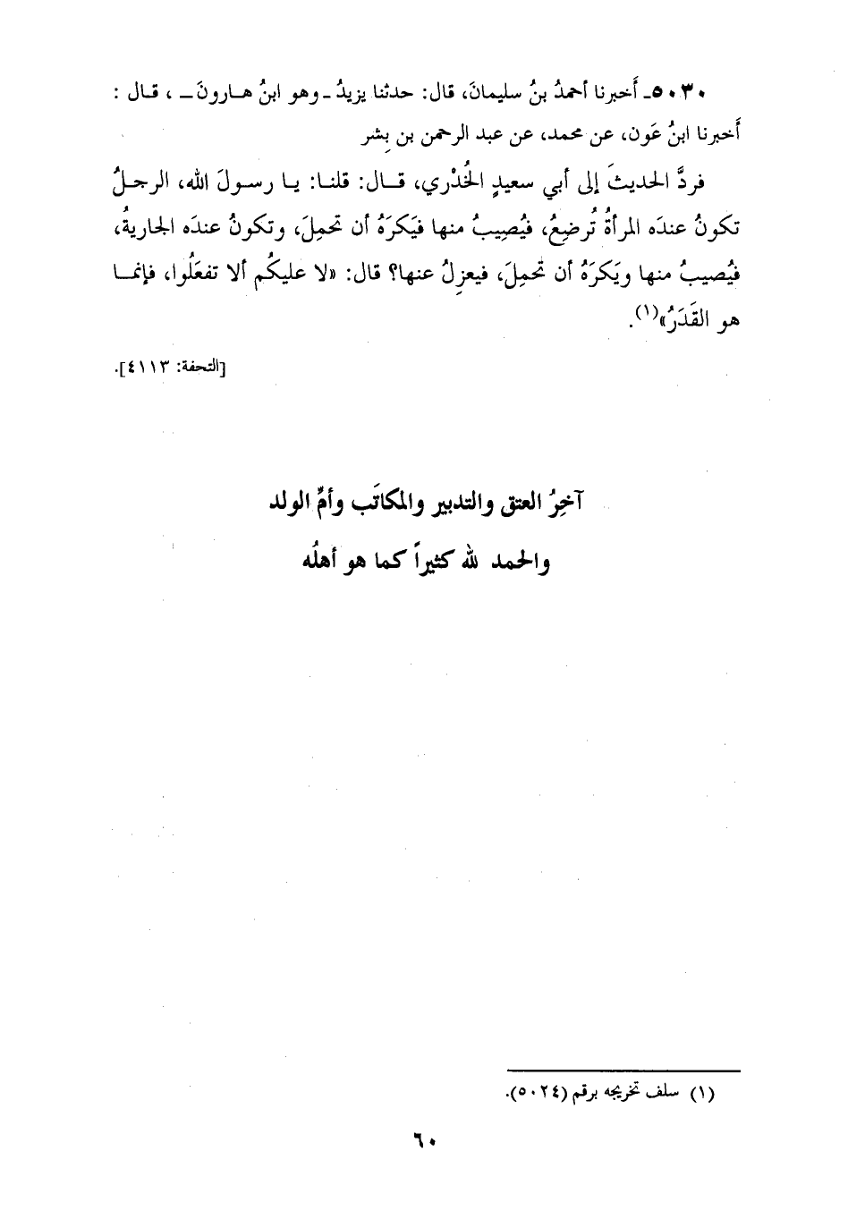 5030 - أَخْبَرَنَا أَحْمَدُ بْنُ سُلَيْمَانَ، قَالَ: حَدَّثَنَا يَزِيدُ وَهُوَ ابْنُ هَارُونَ، قَالَ: أَخْبَرَنَا ابْنُ عَوْنٍ، عَنْ مُحَمَّدٍ، عَنْ عَبْدِ الرَّحْمَنِ بْنِ بِشْرٍ، فَرَدَّ الْحَدِيثَ إِلَى أَبِي سَعِيدٍ الْخُدْرِيِّ، قَالَ: قُلْنَا: يَا رَسُولَ اللهِ الرَّجُلُ تَكُونُ عِنْدَهُ الْمَرْأَةُ تُرْضِعُ، فَيُصِيبُ مِنْهَا فَيَكْرَهُ أَنْ تَحْمِلَ، وَتَكُونُ عِنْدَهُ الْجَارِيَةُ فَيُصِيبُ مِنْهَا وَيَكْرَهُ أَنْ تَحْمِلَ فَيَعْزِلَ عَنْهَا، قَالَ: «§لَا عَلَيْكُمْ أَلَّا تَفْعَلُوا، فَإِنَّمَا هُوَ الْقَدَرُ»