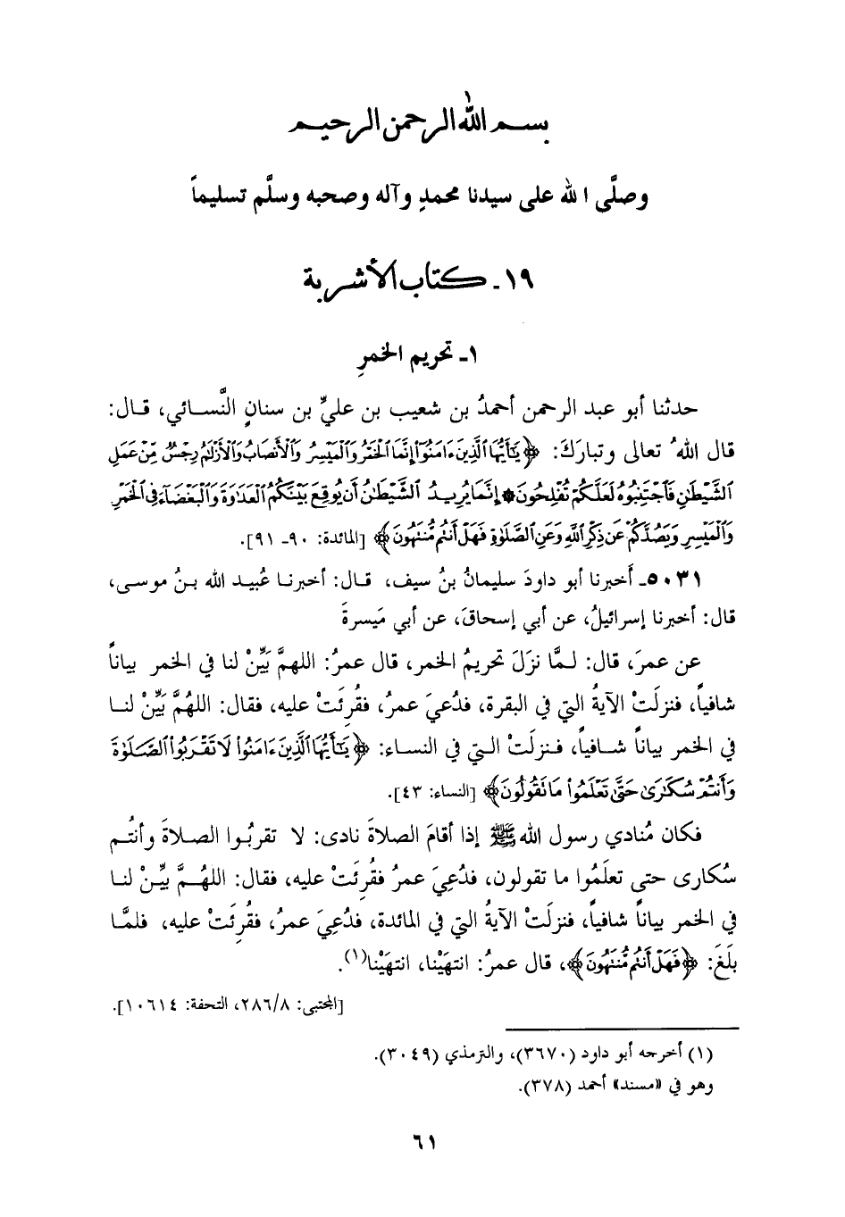 §تَحْرِيمُ الْخَمْرِ حَدَّثَنَا أَبُو عَبْدِ الرَّحْمَنِ أَحْمَدُ بْنُ شُعَيْبِ بْنِ عَلِيِّ بْنِ سِنَانٍ النَّسَائِيُّ، قَالَ: قَالَ اللهُ تَعَالَى وَتَبَارَكَ: {يَا أَيُّهَا الَّذِينَ آمَنُوا إِنَّمَا الْخَمْرُ، وَالْمَيْسِرُ، وَالْأَنْصَابُ، وَالْأَزْلَامُ رِجْسٌ مِنْ عَمَلِ الشَّيْطَانِ، فَاجْتَنِبُوهُ لَعَلَّكُمْ تُفْلِحُونَ إِنَّمَا يُرِيدُ الشَّيْطَانُ أَنْ يُوقِعَ بَيْنَكُمُ الْعَدَاوَةَ، وَالْبَغْضَاءَ فِي الْخَمْرِ، وَالْمَيْسِرِ، وَيَصُدَّكُمْ عَنْ ذِكْرِ اللهِ، وَعَنِ الصَّلَاةِ فَهَلْ أَنْتُمْ مُنْتَهُونَ} [المائدة: 91]