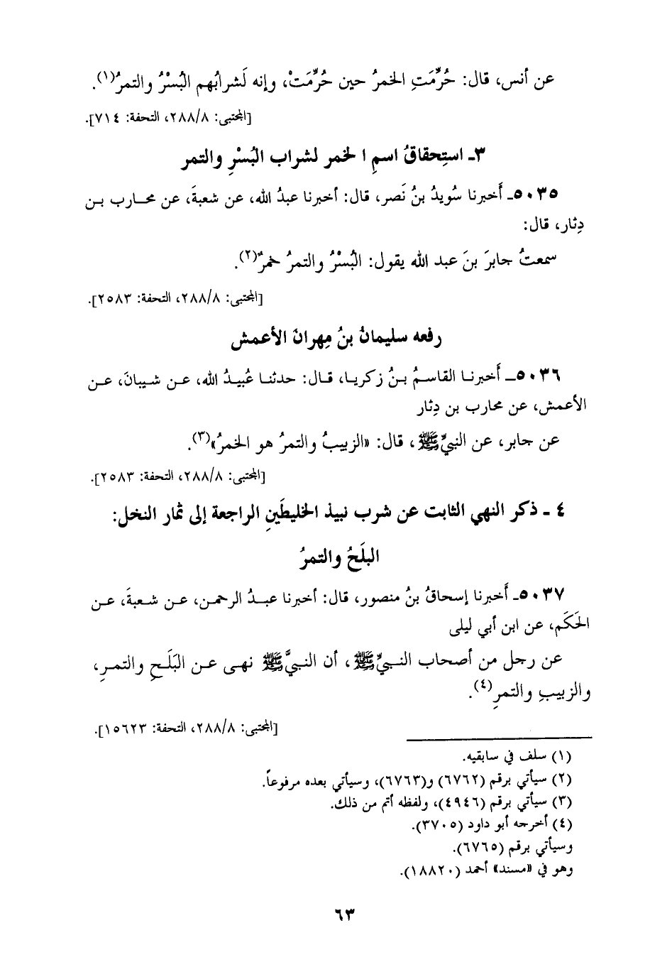 5035 - أَخْبَرَنَا سُوَيْدُ بْنُ نَصْرٍ، قَالَ: أَخْبَرَنَا عَبْدُ اللهِ، عَنْ شُعْبَةَ، عَنْ مُحَارِبِ بْنِ دِثَارٍ، قَالَ: سَمِعْتُ جَابِرٍ بْنَ عَبْدِ اللهِ، يَقُولُ: «§الْبُسْرُ وَالتَّمْرُ خَمْرٌ» رَفَعَهُ سُلَيْمَانُ بْنُ مِهْرَانَ الْأَعْمَشُ