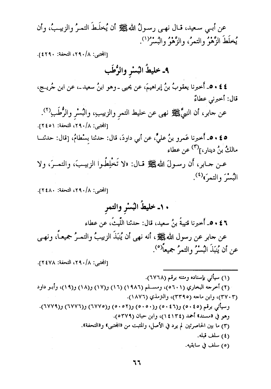 5045 - أَخْبَرَنَا عَمْرُو بْنُ عَلِيٍّ، عَنْ أَبِي دَاوُدَ، قَالَ: حَدَّثَنَا بِسْطَامٌ، قَالَ: حَدَّثَنَا مَالِكُ بْنُ دِينَارٍ، عَنْ عَطَاءٍ، عَنْ جَابِرٍ، أَنَّ رَسُولَ اللهِ صَلَّى اللهُ عَلَيْهِ وَسَلَّمَ قَالَ: «§لَا تَخْلِطُوا الزَّبِيبَ، وَالتَّمْرَ وَلَا الْبُسْرَ وَالتَّمْرَ»