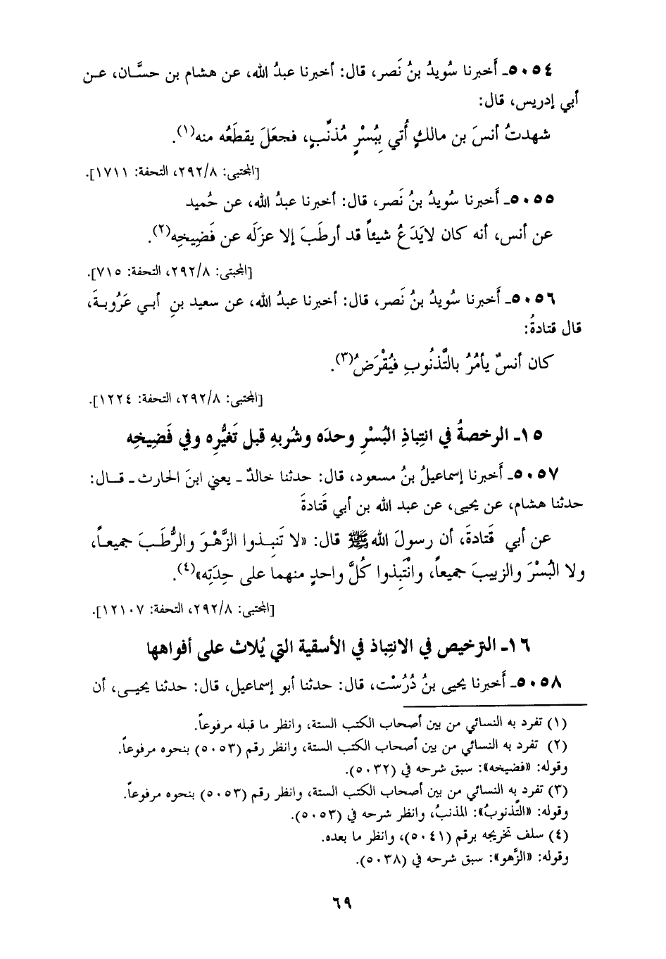 5056 - أَخْبَرَنَا سُوَيْدُ بْنُ نَصْرٍ، قَالَ: أَخْبَرَنَا عَبْدُ اللهِ، عَنْ سَعِيدِ بْنِ أَبِي عَرُوبَةَ، قَالَ قَتَادَةُ: كَانَ أَنَسٌ «§يَأْمُرُ بِالتَّذْنُوبِ فَيُقْرَضُ»