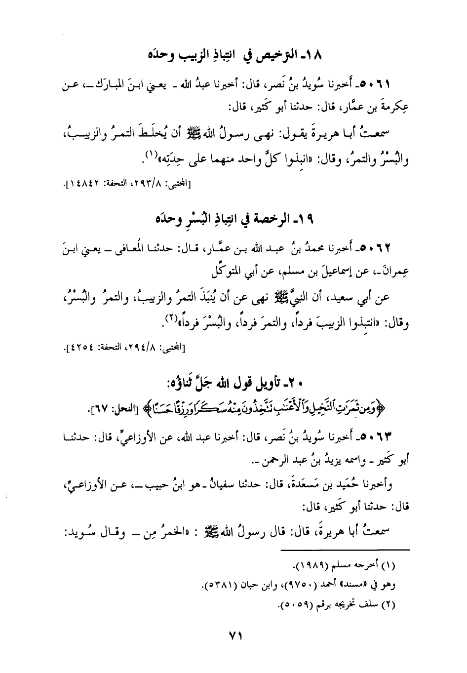 5062 - أَخْبَرَنَا مُحَمَّدُ بْنُ عَبْدِ اللهِ بْنِ عَمَّارٍ، قَالَ: حَدَّثَنَا الْمُعَافَى يَعْنِي ابْنَ عِمْرَانَ، عَنْ إِسْمَاعِيلَ بْنِ مُسْلِمٍ، عَنْ أَبِي الْمُتَوَكِّلِ، عَنْ أَبِي سَعِيدٍ، أَنَّ النَّبِيَّ صَلَّى اللهُ عَلَيْهِ وَسَلَّمَ §نَهَى أَنْ يُنْبَذَ التَّمْرُ، وَالزَّبِيبُ، وَالتَّمْرُ، وَالْبُسْرُ، وَقَالَ: «انْتَبِذُوا الزَّبِيبَ فَرْدًا، وَالتَّمْرَ فَرْدًا، وَالْبُسْرَ فَرْدًا»
