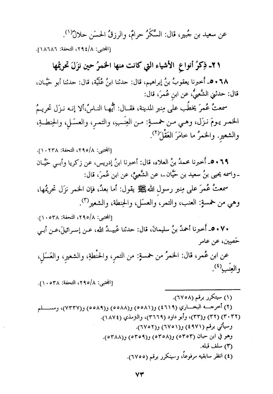 5070 - أَخْبَرَنَا أَحْمَدُ بْنُ سُلَيْمَانَ، قَالَ: حَدَّثَنَا عُبَيْدُ اللهِ، عَنْ إِسْرَائِيلَ، عَنْ أَبِي حَصِينٍ، عَنْ عَامِرٍ، عَنِ ابْنِ عُمَرَ، قَالَ: «§الْخَمْرُ مِنْ خَمْسَةٍ مِنَ التَّمْرِ، وَالْحِنْطَةِ، وَالشَّعِيرِ، وَالْعَسَلِ، وَالْعِنَبِ»