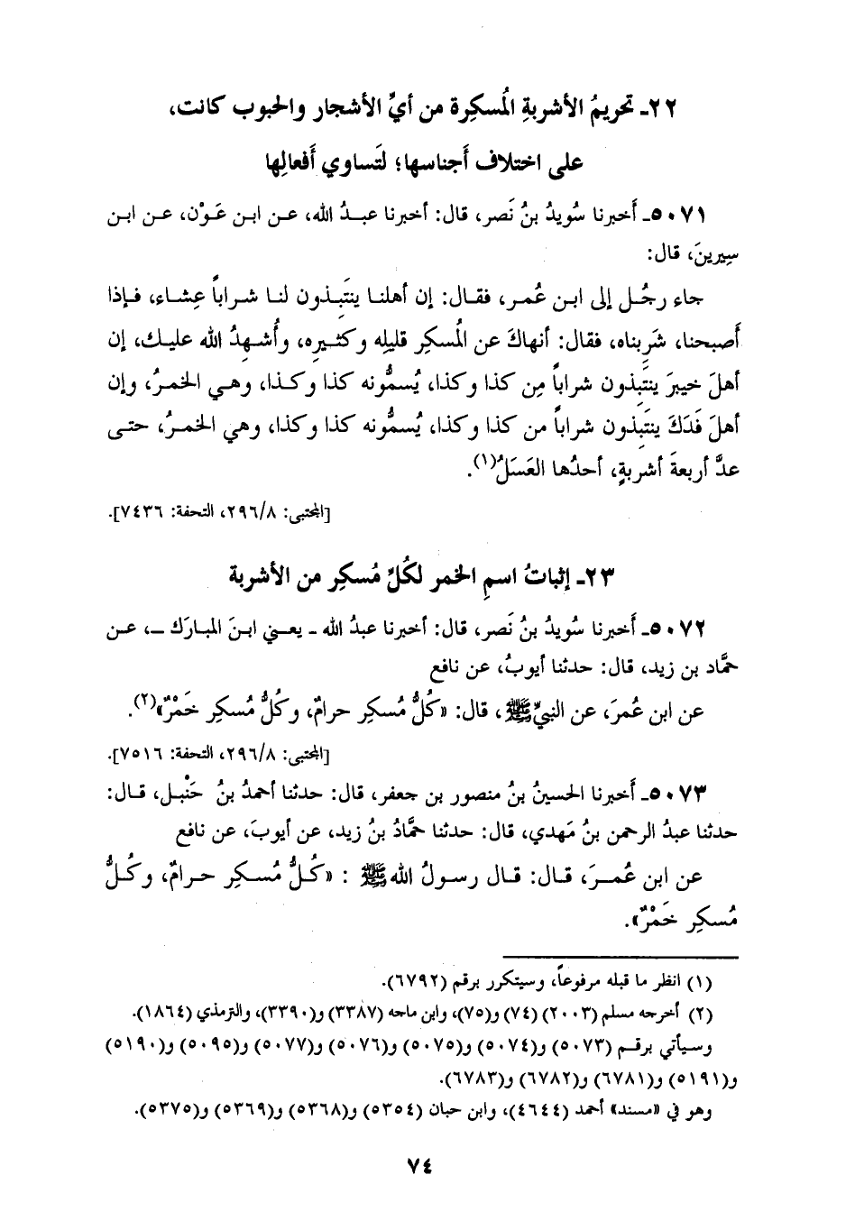 5073 - أَخْبَرَنَا الْحُسَيْنُ بْنُ مَنْصُورِ بْنِ جَعْفَرٍ، قَالَ: حَدَّثَنَا أَحْمَدُ بْنُ حَنْبَلٍ، قَالَ: حَدَّثَنَا عَبْدُ الرَّحْمَنِ بْنُ مَهْدِيٍّ، قَالَ: حَدَّثَنَا حَمَّادُ بْنُ زَيْدٍ، عَنْ أَيُّوبَ، عَنْ نَافِعٍ، عَنِ ابْنِ عُمَرَ، قَالَ: قَالَ رَسُولُ اللهِ صَلَّى اللهُ عَلَيْهِ وَسَلَّمَ: «§كُلُّ مُسْكِرٍ حَرَامٌ وَكُلُّ مُسْكِرٍ خَمْرٌ»، قَالَ الْحُسَيْنُ بْنُ مَنْصُورٍ: قَالَ أَحْمَدُ بْنُ حَنْبَلٍ: وَهَذَا حَدِيثٌ صَحِيحٌ