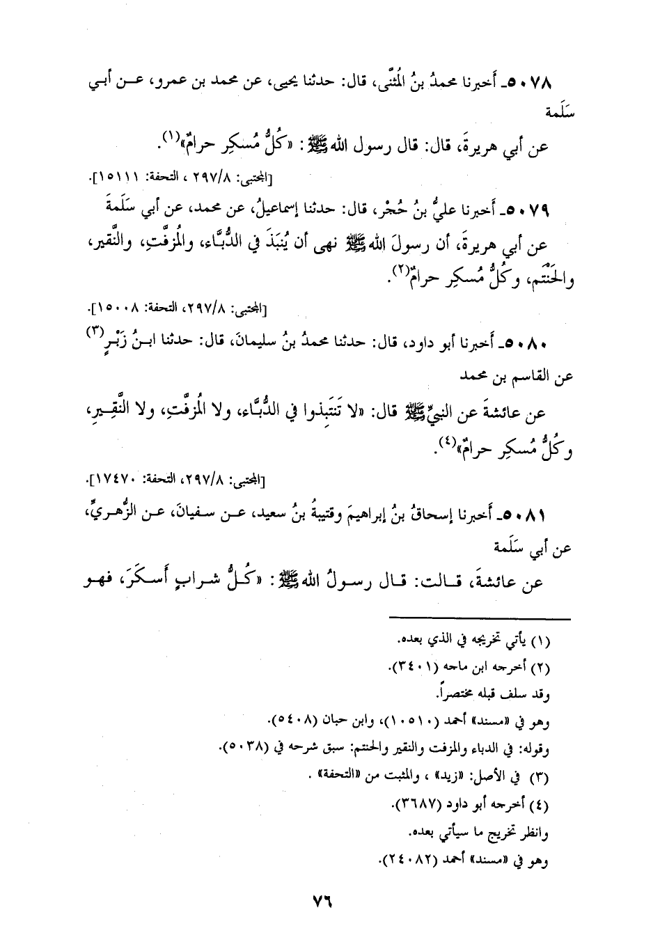 5079 - أَخْبَرَنَا عَلِيُّ بْنُ حُجْرٍ، قَالَ: حَدَّثَنَا إِسْمَاعِيلُ، عَنْ مُحَمَّدٍ، عَنْ أَبِي سَلَمَةَ، عَنْ أَبِي هُرَيْرَةَ، أَنَّ رَسُولَ اللهِ صَلَّى اللهُ عَلَيْهِ وَسَلَّمَ «§نَهَى أَنْ يُنْبَذَ فِي الدُّبَّاءِ، وَالْمُزَفَّتِ، وَالنَّقِيرِ، وَالْحَنْتَمِ، وَكُلُّ مُسْكِرٍ حَرَامٌ»