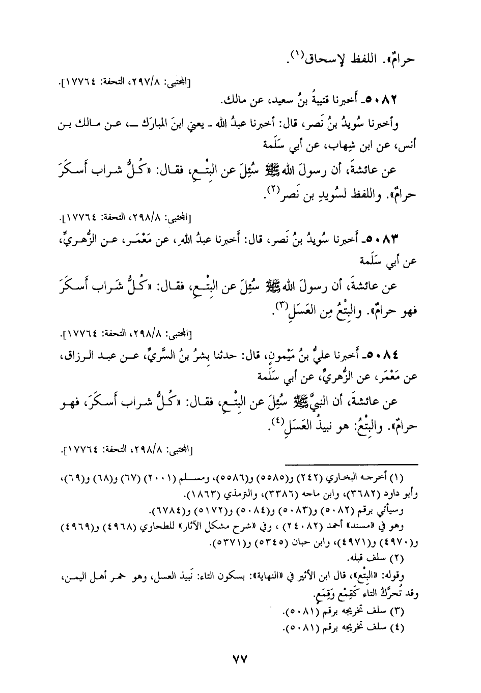 5082 - أَخْبَرَنَا قُتَيْبَةُ بْنُ سَعِيدٍ، عَنْ مَالِكٍ، وَأَخْبَرَنَا سُوَيْدُ بْنُ نَصْرٍ، قَالَ: أَخْبَرَنَا عَبْدُ اللهِ يعني ابْنَ الْمُبَارَكِ، عَنْ مَالِكِ بْنِ أَنَسٍ، عَنِ ابْنِ شِهَابٍ، عَنْ أَبِي سَلَمَةَ، عَنْ عَائِشَةَ أَنَّ رَسُولَ اللهِ صَلَّى اللهُ عَلَيْهِ وَسَلَّمَ سُئِلَ عَنِ الْبِتْعِ، فَقَالَ: «§كُلُّ شَرَابٍ أَسْكَرَ حَرَامٌ»، وَاللَّفْظُ لِسُوَيْدِ بْنِ نَصْرٍ
