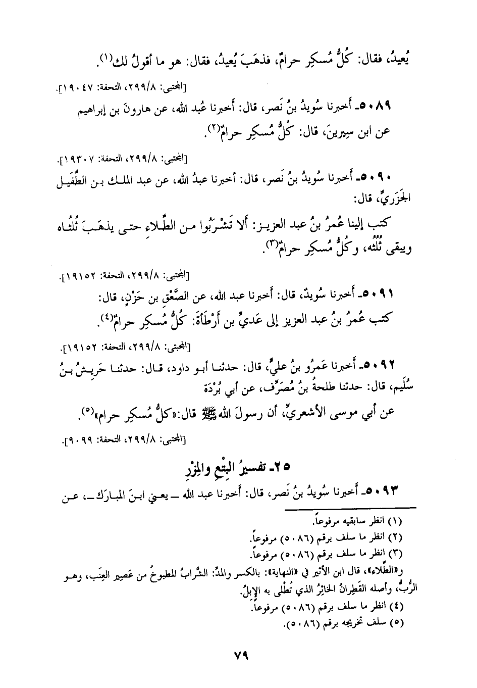 5090 - أَخْبَرَنَا سُوَيْدُ بْنُ نَصْرٍ، قَالَ: أَخْبَرَنَا عَبْدُ اللهِ، عَنْ عَبْدِ الْمَلِكِ بْنِ الطُّفَيْلِ الْجَزَرِيِّ، قَالَ: كَتَبَ إِلَيْنَا عُمَرُ بْنُ عَبْدِ الْعَزِيزِ: «§أَلَا تَشْرَبُوا مِنَ الطِّلَاءِ حَتَّى يَذْهَبَ ثُلُثَاهُ، وَيَبْقَى ثُلُثُهُ وَكُلُّ مُسْكِرٍ حَرَامٌ»