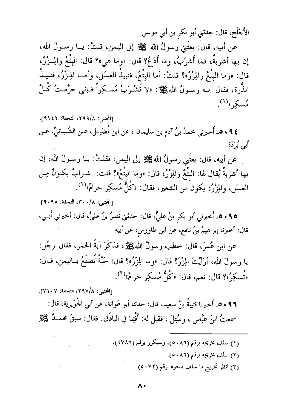 5095 - أَخْبَرَنِي أَبُو بَكْرِ بْنُ عَلِيٍّ، قَالَ: حَدَّثَنِي نَصْرُ بْنُ عَلِيٍّ، قَالَ: أَخْبَرَنِي أَبِي قَالَ: أَخْبَرَنَا إِبْرَاهِيمُ بْنُ نَافِعٍ، عَنِ ابْنِ طَاوُسٍ، عَنْ أَبِيهِ، عَنِ ابْنِ عُمَرَ، قَالَ: خَطَبَ رَسُولُ اللهِ صَلَّى اللهُ عَلَيْهِ وَسَلَّمَ فَذَكَرَ آيَةَ الْخَمْرِ، فَقَالَ رَجُلٌ: يَا رَسُولَ اللهِ أَرَأَيْتَ الْمِزْرَ؟ قَالَ: «وَمَا الْمِزْرُ؟» قَالَ: حَبَّةٌ تُصْنَعُ بِالْيَمَنِ، قَالَ: «تُسْكِرُ؟» قَالَ: نَعَمْ، قَالَ: «§كُلُّ مُسْكِرٍ حَرَامٌ»