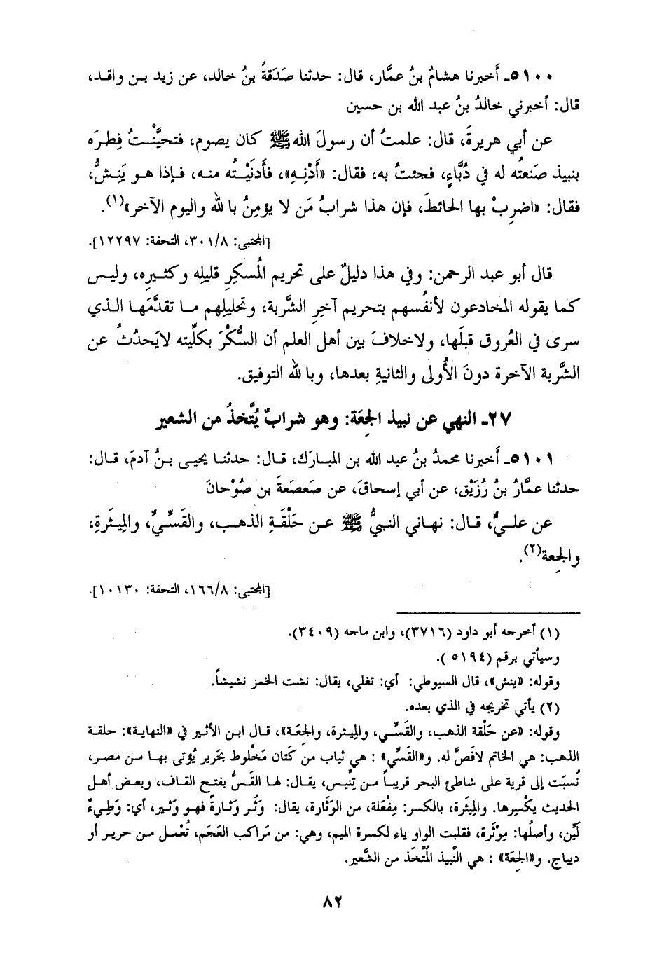 5100 - أَخْبَرَنَا هِشَامُ بْنُ عَمَّارٍ، قَالَ: حَدَّثَنَا صَدَقَةُ بْنُ خَالِدٍ، عَنْ زَيْدِ بْنِ وَاقِدٍ، قَالَ: أَخْبَرَنِي خَالِدُ بْنُ عَبْدِ اللهِ بْنِ حُسَيْنٍ، عَنْ أَبِي هُرَيْرَةَ، قَالَ: عَلِمْتُ أَنَّ رَسُولَ اللهِ صَلَّى اللهُ عَلَيْهِ وَسَلَّمَ كَانَ يَصُومُ، فَتَحَيَّنْتُ فِطْرَهُ بِنَبِيذٍ صَنَعْتُهُ لَهُ فِي دُبَّاءٍ، فَجِئْتُ بِهِ، فَقَالَ: «أَدْنِهِ»، فَأَدْنَيْتُهُ مِنْهُ فَإِذَا هُوَ يَنِشُّ، فَقَالَ: «§اضْرِبْ بِهَا الْحَائِطَ؛ فَإِنَّ هَذَا شَرَابُ مَنْ لَا يُؤْمِنُ بِاللهِ وَالْيَوْمِ الْآخِرِ». قَالَ أَبُو عَبْدِ الرَّحْمَنِ: وَفِي هَذَا دَلِيلٌ عَلَى تَحْرِيمِ الْمُسْكِرِ قَلِيلِهِ وَكَثِيرِهِ، وَلَيْسَ كَمَا يَقُولُهُ الْمُخَادِعُونَ لِأَنْفُسِهِمْ بِتَحْرِيمِ آخِرِ الشَّرْبَةِ وَتَحْلِيلِهِمْ مَا تَقَدَّمَهَا الَّذِي سَرَى فِي الْعُرُوقِ قَبْلَهَا، وَلَا خِلَافَ بَيْنَ أَهْلِ الْعِلْمِ أَنَّ السُّكْرَ بِكُلِّيَّتِهِ، لَا يَحْدُثُ عَنِ الشَّرْبَةِ الْآخِرَةِ دُونَ الْأُولَى وَالثَّانِيَةِ بَعْدَهَا، وَبِاللهِ التَّوْفِيقُ