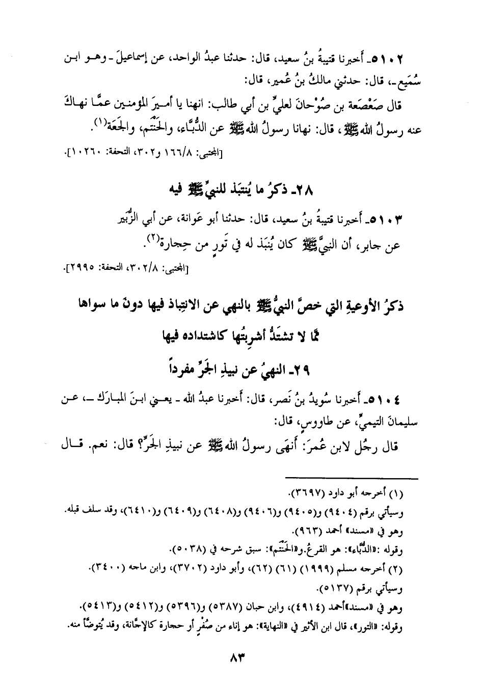 5104 - أَخْبَرَنَا سُوَيْدُ بْنُ نَصْرٍ، قَالَ: أَخْبَرَنَا عَبْدُ اللهِ يَعْنِي ابْنَ الْمُبَارَكِ، عَنْ سُلَيْمَانَ التَّيْمِيِّ، عَنْ طَاوُسٍ، قَالَ: قَالَ رَجُلٌ لِابْنِ عُمَرَ: «§أَنَهَى رَسُولُ اللهِ صَلَّى اللهُ عَلَيْهِ وَسَلَّمَ عَنْ نَبِيذِ الْجَرِّ؟» قَالَ: نَعَمْ قَالَ طَاوُسٌ: وَاللهِ إِنِّي سَمِعْتُهُ مِنْهُ
