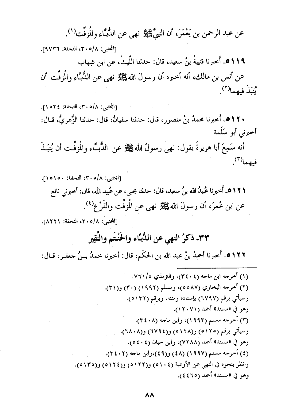 5121 - أَخْبَرَنَا عُبَيْدُ اللهِ بْنُ سَعِيدٍ، قَالَ: حَدَّثَنَا يَحْيَى عَنْ عُبَيْدِ اللهِ، قَالَ: أَخْبَرَنِي نَافِعٌ، عَنِ ابْنِ عُمَرَ، أَنَّ رَسُولَ اللهِ صَلَّى اللهُ عَلَيْهِ وَسَلَّمَ «§نَهَى عَنِ الْمُزَفَّتِ، وَالْقَرْعِ»