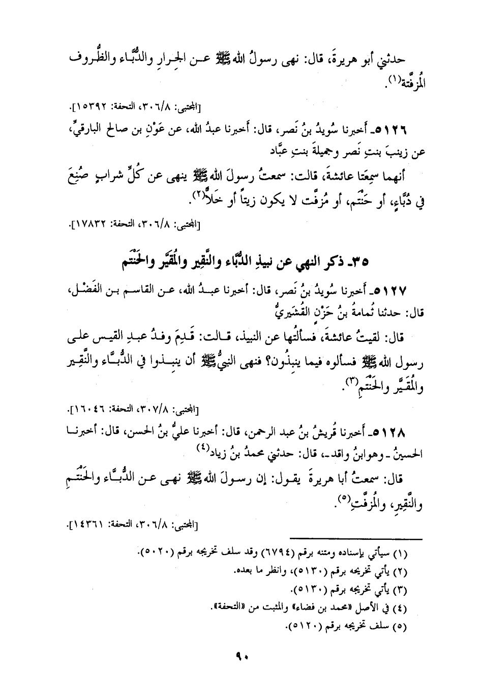 5126 - أَخْبَرَنَا سُوَيْدُ بْنُ نَصْرٍ، قَالَ: أَخْبَرَنَا عَبْدُ اللهِ، عَنْ عَوْنِ بْنِ صَالِحٍ الْبَارِقِيِّ، عَنْ زَيْنَبَ بِنْتِ نَصْرٍ، وَجُمَيْلَةَ بِنْتِ عَبَّادٍ، أَنَّهُمَا سَمِعَتَا عَائِشَةَ، قَالَتْ: سَمِعْتُ رَسُولَ اللهِ صَلَّى اللهُ عَلَيْهِ وَسَلَّمَ «§يَنْهَى عَنْ كُلِّ شَرَابٍ صُنِعَ فِي دُبَّاءٍ أَوْ حَنْتَمٍ أَوْ مُزَفَّتٍ لَا يَكُونُ زَيْتًا أَوْ خَلًّا»