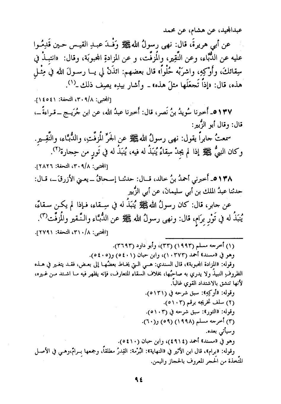 5136 - أَخْبَرَنَا سَوَّارُ بْنُ عَبْدِ اللهِ بْنِ سَوَّارٍ، قَالَ: حَدَّثَنَا عَبْدُ الْوَهَّابِ بْنُ عَبْدِ الْمَجِيدِ، عَنْ هِشَامٍ، عَنْ مُحَمَّدٍ، عَنْ أَبِي هُرَيْرَةَ، قَالَ: §نَهَى رَسُولُ اللهِ صَلَّى اللهُ عَلَيْهِ وَسَلَّمَ وَفْدَ عَبْدِ الْقَيْسِ حِينَ قَدِمُوا عَلَيْهِ عَنِ الدُّبَّاءِ، وَعَنِ النَّقِيرِ، وَالْمُزَفَّتِ، وَعَنِ الْمَزَادَةِ، الْمَجْبُوبَةِ، وَقَالَ: «انْتَبِذْ فِي سِقَائِكَ، وَأَوْكِهِ وَاشْرَبْهُ حُلْوًا»، قَالَ بَعْضُهُمْ: ائْذَنْ لِي يَا رَسُولَ اللهِ فِي مِثْلِ هَذِهِ، قَالَ: «إِذًا تَجْعَلُهَا مِثْلَ هَذِهِ»، وَأَشَارَ بِيَدِهِ يَصِفُ ذَلِكَ