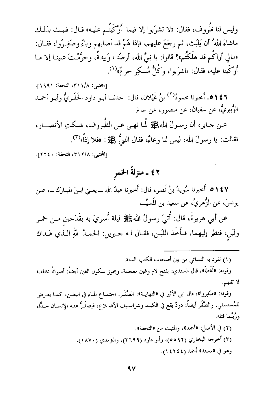 5146 - أَخْبَرَنَا مَحْمُودُ بْنُ غَيْلَانَ، قَالَ: حَدَّثَنَا أَبُو دَاوُدَ الْحَفَرِيُّ، وَأَبُو أَحْمَدَ الزُّبَيْرِيُّ عَنْ سُفْيَانَ، عَنْ مَنْصُورٍ، عَنْ سَالِمٍ، عَنْ جَابِرٍ، أَنَّ رَسُولَ اللهِ صَلَّى اللهُ عَلَيْهِ وَسَلَّمَ لَمَّا §نَهَى عَنِ الظُّرُوفِ شَكَتِ الْأَنْصَارُ فَقَالَتْ: يَا رَسُولَ اللهِ لَيْسَ لَنَا وِعَاءٌ، فَقَالَ النَّبِيُّ صَلَّى اللهُ عَلَيْهِ وَسَلَّمَ: «فَلَا إِذًا»