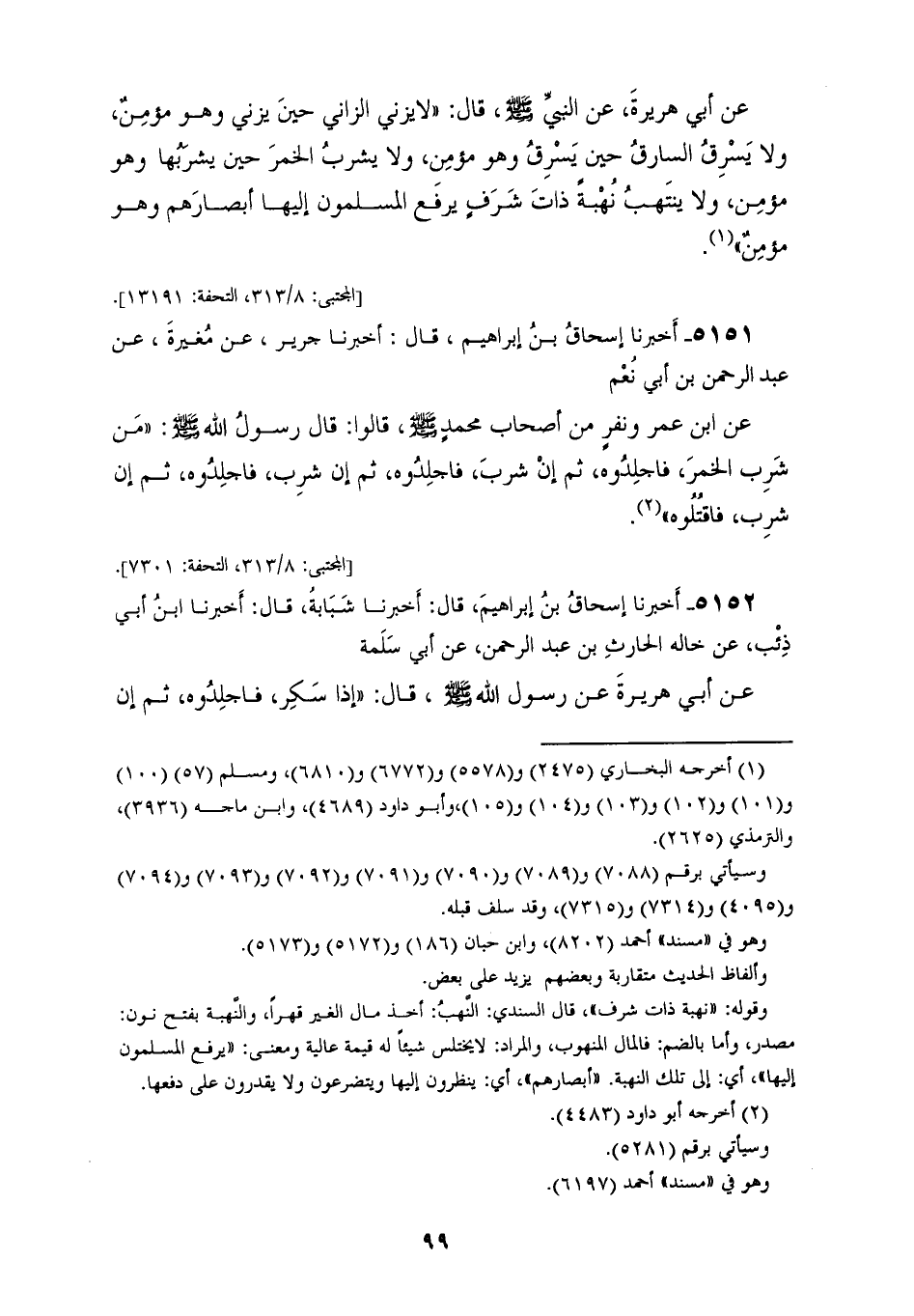 5150 - أَخْبَرَنَا إِسْحَاقُ بْنُ إِبْرَاهِيمَ، قَالَ: أَخْبَرَنَا الْوَلِيدُ بْنُ مُسْلِمٍ، عَنِ الْأَوْزَاعِيِّ، عَنِ الزُّهْرِيِّ، قَالَ: حَدَّثَنِي سَعِيدُ بْنُ الْمُسَيِّبِ، وَأَبُو سَلَمَةَ بْنُ عَبْدِ الرَّحْمَنِ وَأَبُو بَكْرِ بْنُ عَبْدِ الرَّحْمَنِ كُلُّهُمْ حَدِّثُونِي عَنْ أَبِي هُرَيْرَةَ، عَنِ النَّبِيِّ صَلَّى اللهُ عَلَيْهِ وَسَلَّمَ قَالَ: «§لَا يَزْنِي الزَّانِي حِينَ يَزْنِي وَهُوَ مُؤْمِنٌ، وَلَا يَسْرِقُ السَّارِقِ حِينَ يَسْرِقُ وَهُوَ مُؤْمِنٌ، وَلَا يَشْرَبُ الْخَمْرَ حِينَ يَشْرَبُهَا وَهُوَ مُؤْمِنٌ، وَلَا يَنْتَهِبُ نُهْبَةً ذَاتَ شَرَفٍ يَرْفَعُ الْمُسْلِمُونَ إِلَيْهَا أَبْصَارَهُمْ وَهُوَ مُؤْمِنٌ»