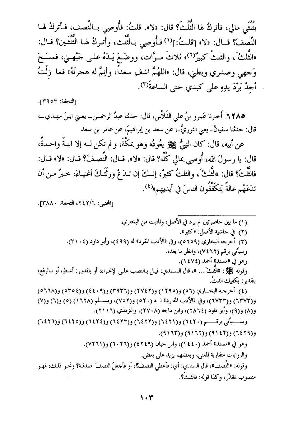 6285 - أَخْبَرَنَا عَمْرُو بْنُ عَلِيٍّ الْفَلَّاسُ، قَالَ: حَدَّثَنَا عَبْدُ الرَّحْمَنِ، يَعْنِي ابْنَ مَهْدِيٍّ، قَالَ: حَدَّثَنَا سُفْيَانُ، يَعْنِي الثَّوْرِيَّ، عَنْ سَعْدِ بْنِ إِبْرَاهِيمَ، عَنْ عَامِرِ بْنِ سَعْدٍ، عَنْ أَبِيهِ، قَالَ: كَانَ النَّبِيُّ صَلَّى اللهُ عَلَيْهِ وَسَلَّمَ يَعُودُهُ وَهُوَ بِمَكَّةَ، وَلَمْ تَكُنْ لَهُ إِلَّا ابْنَةٌ وَاحِدَةٌ، قَالَ: يَا رَسُولَ اللهِ، أُوصِي بِمَالِي كُلِّهِ؟، قَالَ: «لَا»، قَالَ: النِّصْفُ؟، قَالَ: «لَا»، قَالَ: فَالثُّلُثُ؟، قَالَ: " §الثُّلُثُ، وَالثُّلُثُ كَثِيرٌ، إِنَّكَ إِنْ تَدَعْ وَرَثَتَكَ أَغْنِيَاءَ خَيْرٌ مِنْ أَنْ تَدَعَهُمْ عَالَةً يَتَكَفَّفُونَ النَّاسَ فِي أَيْدِيهِمْ