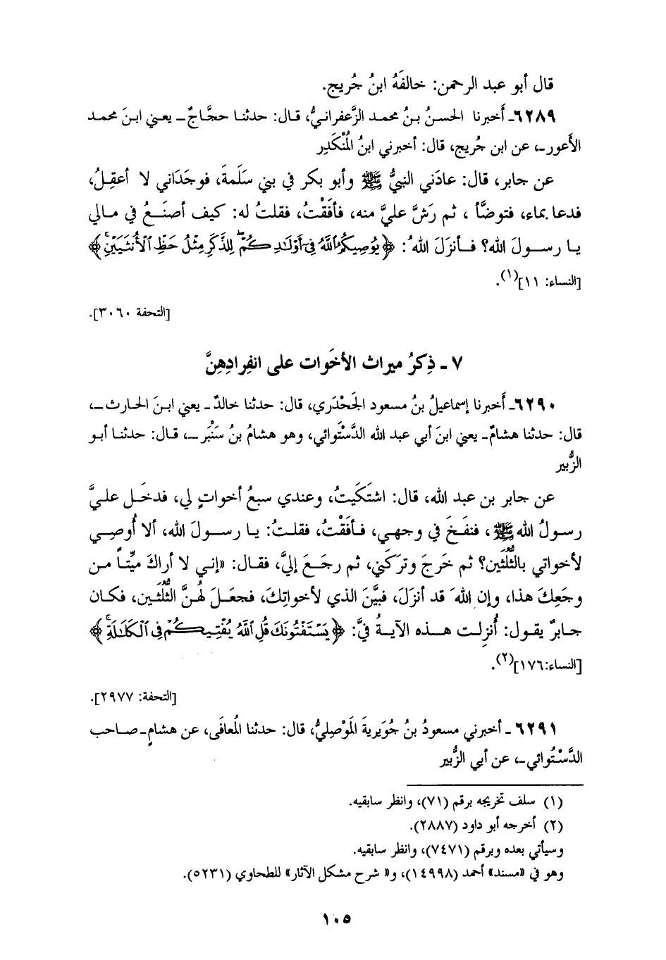 6290 - أَخْبَرَنَا إِسْمَاعِيلُ بْنُ مَسْعُودٍ الْجَحْدَرِيُّ، قَالَ: حَدَّثَنَا خَالِدٌ، يَعْنِي ابْنَ الْحَارِثِ، قَالَ: حَدَّثَنَا هِشَامٌ، يَعْنِي ابْنَ أَبِي عَبْدِ اللهِ الدَّسْتُوَائِيَّ وَهُوَ هِشَامُ بْنُ سَنْبَرٍ، قَالَ: حَدَّثَنَا أَبُو الزُّبَيْرِ، عَنْ جَابِرِ بْنِ عَبْدِ اللهِ، قَالَ: اشْتَكَيْتُ وَعِنْدِي سَبْعُ أَخَوَاتٍ لِي، فَدَخَلَ عَلَيَّ رَسُولُ اللهِ صَلَّى اللهُ عَلَيْهِ وَسَلَّمَ، فَنَفَخَ فِي وَجْهِي، فَأَفَقْتُ، فَقُلْتُ: يَا رَسُولَ اللهِ، أَلَا أُوصِي لِأَخَوَاتِي بِالثُّلُثَيْنِ؟، ثُمَّ خَرَجَ وَتَرَكَنِي، ثُمَّ رَجَعَ إِلَيَّ، فَقَالَ: §إِنِّي لَا أَرَاكَ مَيِّتًا مِنْ وَجَعِكَ هَذَا، وَإِنَّ اللهَ قَدْ أَنْزَلَ، فَبَيَّنَ الَّذِي لِأَخَوَاتِكَ، فَجَعَلَ لَهُنَّ الثُّلُثَيْنِ "، فَكَانَ جَابِرٌ يَقُولُ: أُنْزِلَتْ هَذِهِ الْآيَةُ فِيَّ: {يَسْتَفْتُونَكَ قُلِ اللهُ يُفْتِيكُمْ فِي الْكَلَالَةِ} [النساء: 176]