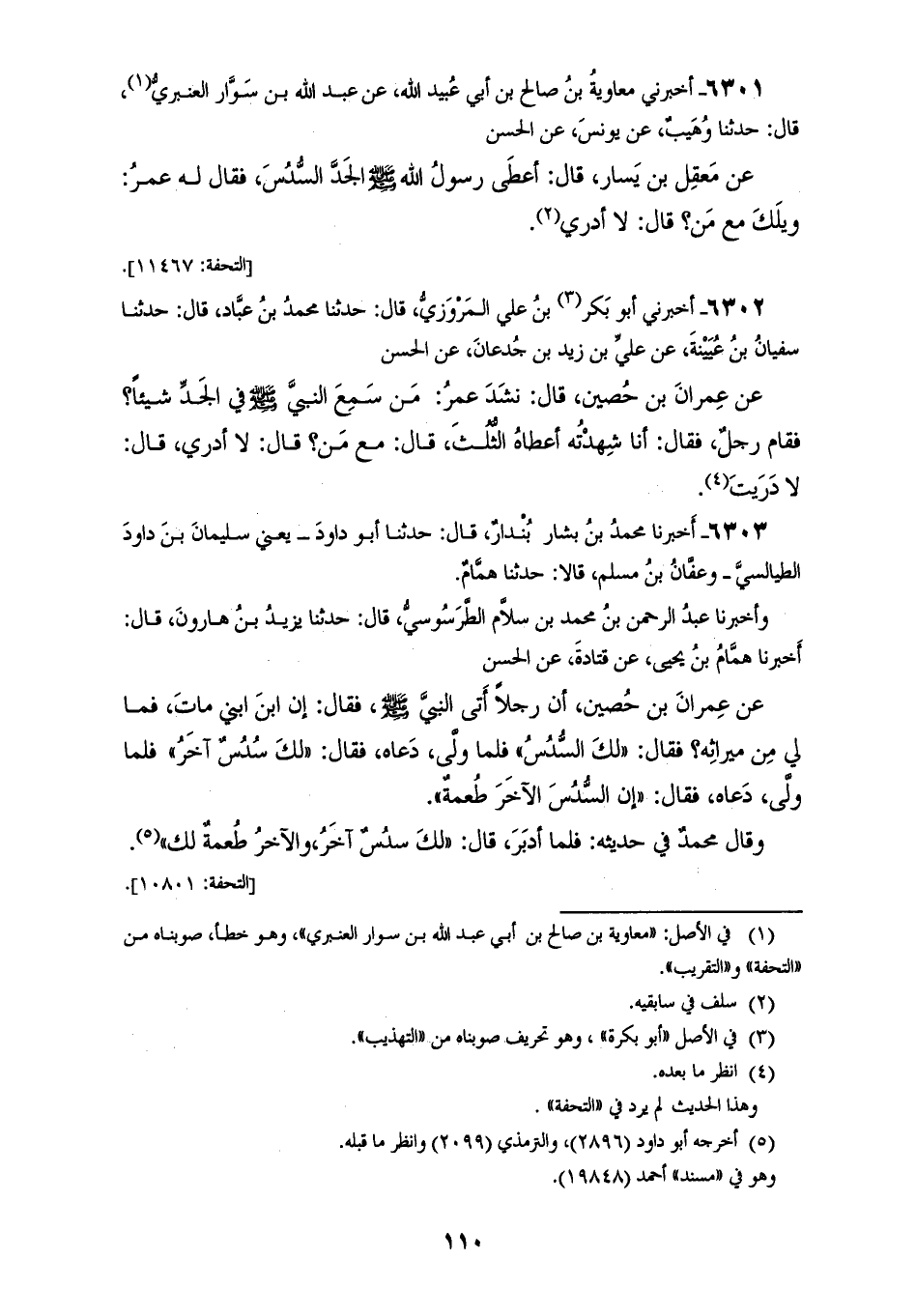6301 - أَخْبَرَنِي مُعَاوِيَةُ بْنُ صَالِحٍ بْنِ أَبِي عُبَيْدِ اللهِ، عَنْ عَبْدِ اللهِ بْنِ سَوَّارٍ الْعَنْبَرِيِّ، قَالَ: حَدَّثَنَا وُهَيْبٌ، عَنْ يُونُسَ، عَنِ الْحَسَنِ، عَنْ مَعْقِلِ بْنِ يَسَارٍ، قَالَ: أَعْطَى رَسُولُ اللهِ صَلَّى اللهُ عَلَيْهِ وَسَلَّمَ §الْجَدَّ السُّدُسَ، فَقَالَ لَهُ عُمَرُ: وَيْلَكَ، مَعَ مَنْ؟، قَالَ: لَا أَدْرِي