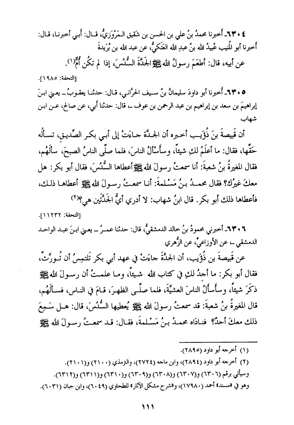 6306 - أَخْبَرَنِي مَحْمُودُ بْنُ خَالِدٍ الدِّمَشْقِيُّ، قَالَ: حَدَّثَنَا عُمَرُ يَعْنِي ابْنَ عَبْدِ الْوَاحِدِ الدِّمَشْقِيَّ، عَنِ الْأَوْزَاعِيِّ، عَنِ الزُّهْرِيِّ، عَنْ قَبِيصَةَ بْنِ ذُؤَيْبٍ، أَنَّ الْجَدَّةَ جَاءَتْ فِي عَهْدِ أَبِي بَكْرٍ تَلْتَمِسُ أَنْ تُوَرَّثَ، فَقَالَ أَبُو بَكْرٍ: مَا أَجِدُ لَكِ فِي كِتَابِ اللهِ شَيْئًا، وَمَا عَلِمْتُ أَنَّ رَسُولَ اللهِ صَلَّى اللهُ عَلَيْهِ وَسَلَّمَ ذَكَرَ شَيْئًا، وَسَأَسْأَلُ النَّاسَ الْعَشِيَّةَ، فَلَمَّا صَلَّى الظُّهْرَ قَامَ فِي النَّاسِ فَسَأَلَهُمْ، قَالَ الْمُغِيرَةُ بْنُ شُعْبَةَ: قَدْ سَمِعْتُ رَسُولَ اللهِ صَلَّى اللهُ عَلَيْهِ وَسَلَّمَ §يُعْطِيهَا السُّدُسَ، قَالَ: هَلْ سَمِعَ ذَلِكَ مَعَكَ أَحَدٌ؟، فَنَادَاهُ مُحَمَّدُ بْنُ مَسْلَمَةَ، فَقَالَ: قَدْ سَمِعْتُ رَسُولَ اللهِ صَلَّى اللهُ عَلَيْهِ وَسَلَّمَ يُعْطِيهَا السُّدُسَ، فَأَنْفَذَ ذَلِكَ أَبُو بَكْرٍ أَخْبَرَنَا نَصْرُ بْنُ عَلِيِّ بْنِ نَصْرٍ الْجَهْضَمِيُّ، قَالَ: أَخْبَرَنَا عَبْدُ الْأَعْلَى يَعْنِي ابْنَ عَبْدِ الْأَعْلَى، قَالَ: حَدَّثَنَا مَعْمَرٌ، عَنِ الزُّهْرِيِّ، عَنْ قَبِيصَةَ بْنِ ذُؤَيْبٍ، أَنَّ جَدَّةً أَتَتْ أَبَا بَكْرٍ، وَسَاقَ الْحَدِيثَ -[112]-.