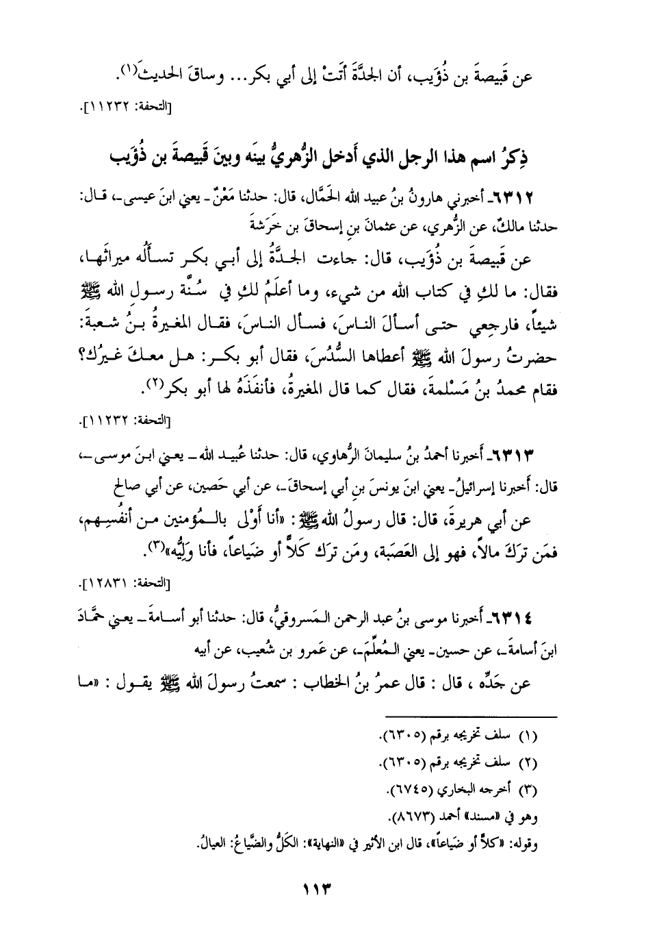 6312 - أَخْبَرَنِي هَارُونُ بْنُ عُبَيْدِ اللهِ الْحَمَّالُ، قَالَ: حَدَّثَنَا مَعْنٌ يَعْنِي ابْنَ عِيسَى، قَالَ: حَدَّثَنَا مَالِكٌ، عَنِ الزُّهْرِيِّ، عَنْ عُثْمَانَ بْنِ إِسْحَاقَ بْنِ خَرَشَةَ، عَنْ قَبِيصَةَ بْنِ ذُؤَيْبٍ، قَالَ: جَاءَتِ الْجَدَّةُ إِلَى أَبِي بَكْرٍ تَسْأَلُهُ مِيرَاثَهَا، فَقَالَ: مَا لَكِ فِي كِتَابِ اللهِ مِنْ شَيْءٍ، وَمَا أَعْلَمُ لَكِ فِي سُنَّةِ رَسُولِ اللهِ صَلَّى اللهُ عَلَيْهِ وَسَلَّمَ شَيْئًا، فَارْجِعِي حَتَّى أَسْأَلَ النَّاسَ، فَسَأَلَ النَّاسَ، فَقَالَ الْمُغِيرَةُ بْنُ شُعْبَةَ: «§حَضَرْتُ رَسُولَ اللهِ صَلَّى اللهُ عَلَيْهِ وَسَلَّمَ أَعْطَاهَا السُّدُسَ»، فَقَالَ أَبُو بَكْرٍ: هَلْ مَعَكَ غَيْرُكَ؟، فَقَامَ مُحَمَّدُ بْنُ مَسْلَمَةَ فَقَالَ كَمَا قَالَ الْمُغِيرَةُ، فَأَنْفَذَهُ لَهَا أَبُو بَكْرٍ