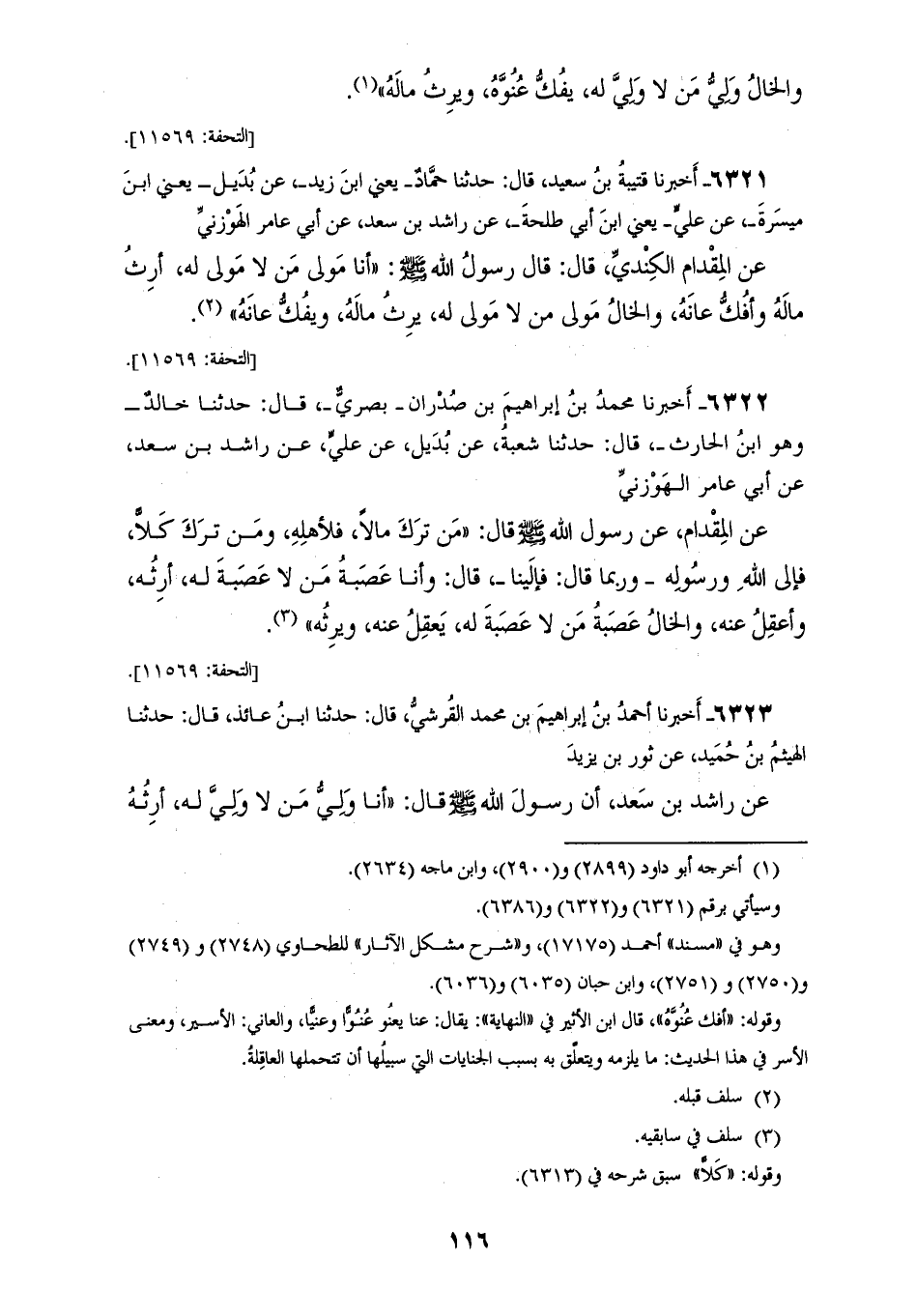 6321 - أَخْبَرَنَا قُتَيْبَةُ بْنُ سَعِيدٍ، قَالَ: حَدَّثَنَا حَمَّادٌ يَعْنِي ابْنَ زَيْدٍ، عَنْ بُدَيْلٍ يَعْنِي ابْنَ مَيْسَرَةَ، عَنْ عَلِيٍّ، يَعْنِي ابْنَ أَبِي طَلْحَةَ، عَنْ رَاشِدِ بْنِ سَعْدٍ، عَنْ أَبِي عَامِرٍ الْهَوْزَنِيِّ، عَنِ الْمِقْدَامِ الْكِنْدِيِّ، قَالَ: قَالَ رَسُولُ اللهِ صَلَّى اللهُ عَلَيْهِ وَسَلَّمَ: " §أَنَا مَوْلَى مَنْ لَا مَوْلَى لَهُ، أَرِثُ مَالَهُ وَأَفُكُّ عَانَهُ، وَالْخَالُ مَوْلَى مَنْ لَا مَوْلَى لَهُ، يَرِثُ مَالَهُ وَيَفُكُّ عَانَهُ