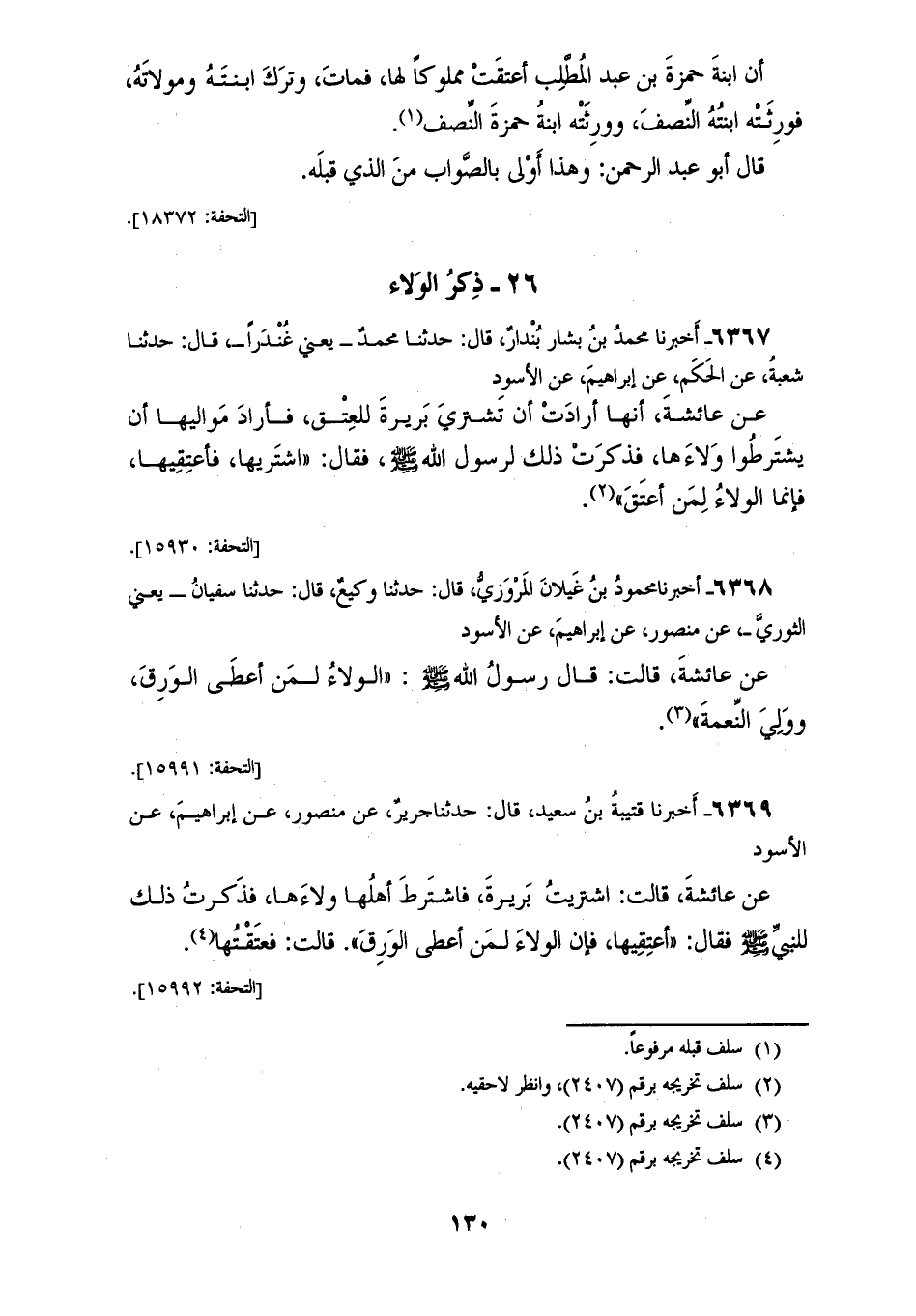 6369 - أَخْبَرَنَا قُتَيْبَةُ بْنُ سَعِيدٍ، قَالَ: حَدَّثَنَا جَرِيرٌ، عَنْ مَنْصُورٍ، عَنْ إِبْرَاهِيمَ، عَنِ الْأَسْوَدِ، عَنْ عَائِشَةَ، قَالَتْ: اشْتَرَيْتُ بَرِيرَةَ، فَاشْتَرَطَ أَهْلُهَا وَلَاءَهَا، فَذَكَرْتُ ذَلِكَ لِلنَّبِيِّ صَلَّى اللهُ عَلَيْهِ وَسَلَّمَ، فَقَالَ: «§أَعْتِقِيهَا، فَإِنَّ الْوَلَاءَ لِمَنْ أَعْطَى الْوَرِقَ»، قَالَتْ: فَعَتَقْتُهَا "