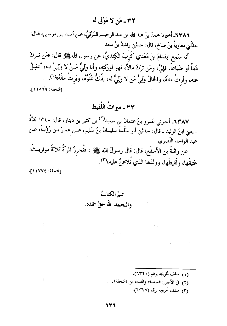 6386 - أَخْبَرَنَا مُحَمَّدُ بْنُ عَبْدِ اللهِ بْنِ عَبْدِ الرَّحِيمِ الْبَرْقِيُّ، عَنْ أَسَدِ بْنِ مُوسَى، قَالَ: حَدَّثَنِي مُعَاوِيَةُ بْنُ صَالِحٍ، قَالَ: حَدَّثَنِي رَاشِدُ بْنُ سَعْدٍ، أَنَّهُ سَمِعَ الْمِقْدَامَ بْنَ مَعْدِيكَرِبَ الْكِنْدِيَّ، عَنْ رَسُولِ اللهِ صَلَّى اللهُ عَلَيْهِ وَسَلَّمَ، قَالَ: «§مَنْ تَرَكَ دَيْنًا أَوْ ضَيَاعًا فَإِلَيَّ، وَمَنْ تَرَكَ مَالًا فَهُوَ لِوَرَثَتِهِ، وَأَنَا وَلِيُّ مَنْ لَا وَلِيَّ لَهُ، أَعْقِلُ عَنْهُ، وَأَرِثُ مَالَهُ، وَالْخَالُ وَلِيُّ مَنْ لَا وَلِيَّ لَهُ، يَفُكُّ عَنْوَهُ، وَيَرِثُ مَالَهُ»