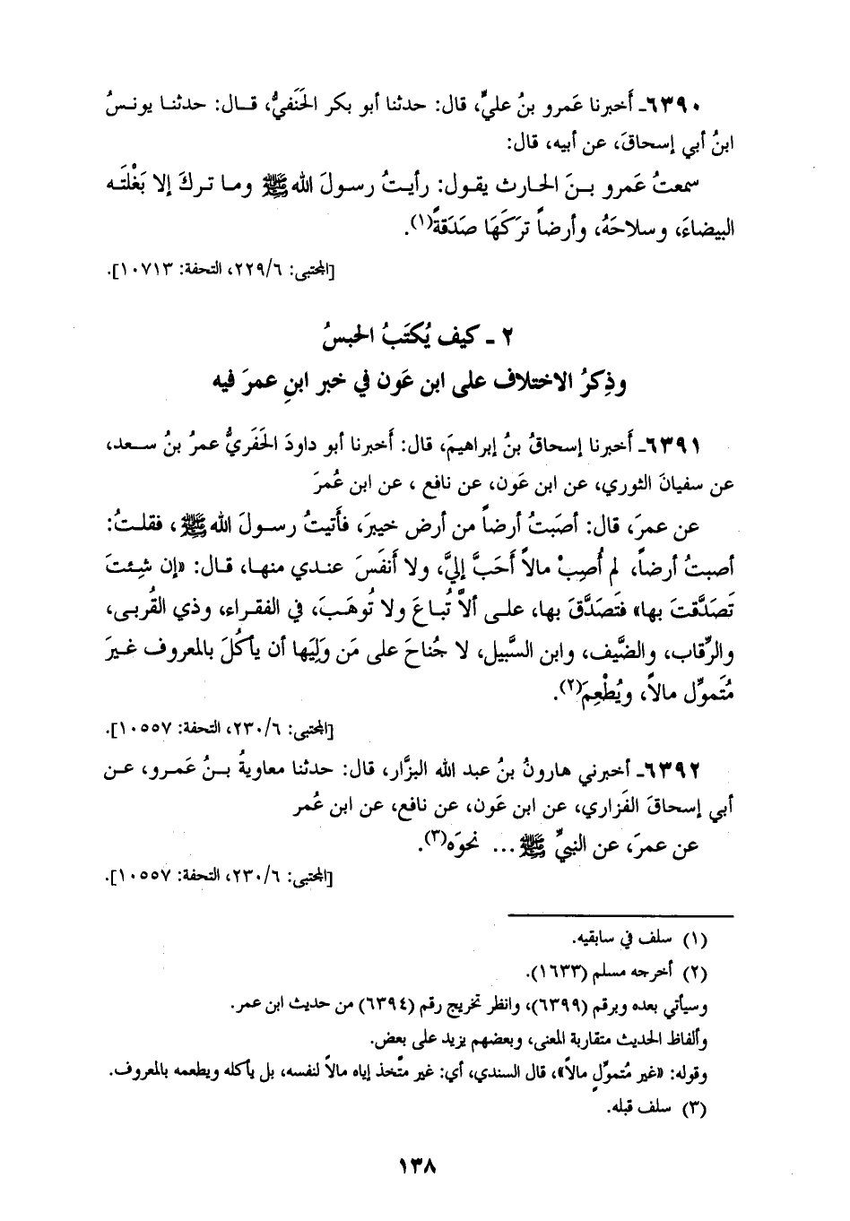 6391 - أَخْبَرَنَا إِسْحَاقُ بْنُ إِبْرَاهِيمَ، قَالَ: أَخْبَرَنَا أَبُو دَاوُدَ الْحَفَرِيُّ عُمَرُ بْنُ سَعْدٍ، عَنْ سُفْيَانَ الثَّوْرِيِّ، عَنِ ابْنِ عَوْنٍ، عَنْ نَافِعٍ، عَنِ ابْنِ عُمَرَ، عَنْ عُمَرَ، قَالَ: أَصَبْتُ أَرْضًا مِنْ أَرْضِ خَيْبَرَ، فَأَتَيْتُ رَسُولَ اللهِ صَلَّى اللهُ عَلَيْهِ وَسَلَّمَ، فَقُلْتُ: §أَصَبْتُ أَرْضًا، لَمْ أُصِبْ مَالًا أَحَبَّ إِلَيَّ، وَلَا أَنْفَسَ عِنْدِي مِنْهَا، قَالَ: «إِنْ شِئْتَ تَصَدَّقْتَ بِهَا»، فَتَصَدَّقَ بِهَا عَلَى أَلَّا تُبَاعَ وَلَا تُوهَبَ، فِي الْفُقَرَاءِ، وَذِي الْقُرْبَى، وَالرِّقَابِ، وَالضَّيْفِ، وَابنِ السَّبِيلِ، لَا جُنَاحَ عَلَى مَنْ وَلِيَهَا أَنْ يَأْكُلَ بِالْمَعْرُوفِ غَيْرَ مُتَمَوِّلٍ مَالًا، وَيُطْعِمَ