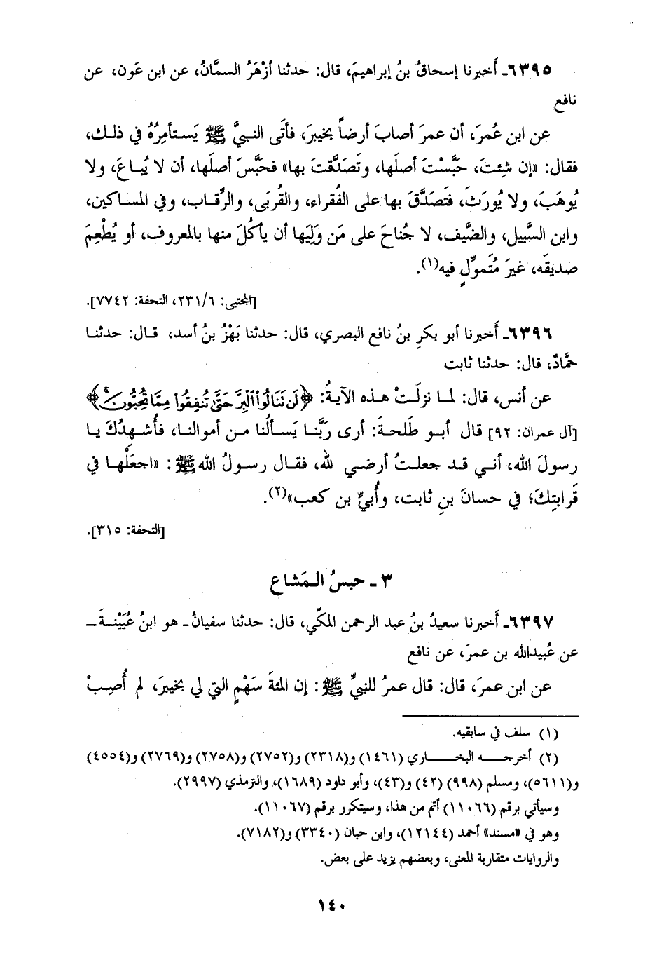 6397 - أَخْبَرَنَا سَعِيدُ بْنُ عَبْدِ الرَّحْمَنِ الْمَكِّيُّ، قَالَ: حَدَّثَنَا سُفْيَانُ هُوَ ابْنُ عُيَيْنَةَ، عَنْ عُبَيْدِ اللهِ بْنِ عُمَرَ، عَنْ نَافِعٍ، عَنِ ابْنِ عُمَرَ، قَالَ: قَالَ عُمَرُ لِلنَّبِيِّ صَلَّى اللهُ عَلَيْهِ وَسَلَّمَ: إِنَّ §الْمِائَةَ سَهْمٍ الَّتِي لِي بِخَيْبَرَ لَمْ أُصِبْ مَالًا قَطُّ هُوَ أَعْجَبَ إِلَيَّ مِنْهَا، قَدْ أَرَدْتُ أَنْ أَتَصَدَّقَ بِهَا. فَقَالَ النَّبِيُّ صَلَّى اللهُ عَلَيْهِ وَسَلَّمَ: «احْبِسْ أَصْلَهَا، وَسَبِّلْ ثَمَرَتَهَا»