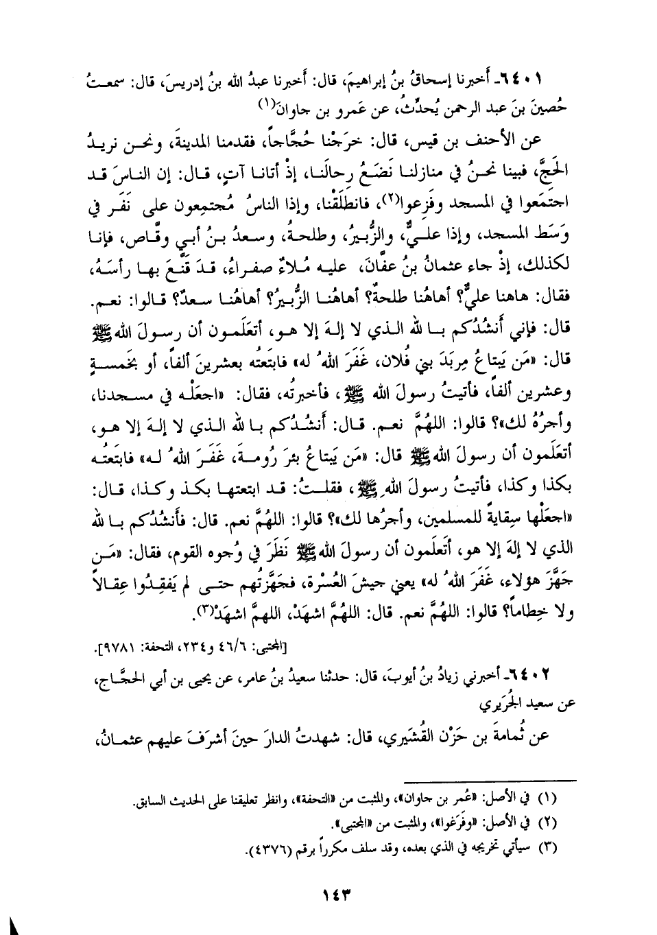 6401 - أَخْبَرَنَا إِسْحَاقُ بْنُ إِبْرَاهِيمَ، قَالَ أَخْبَرَنَا عَبْدُ اللهِ بْنُ إِدْرِيسَ، قَالَ: سَمِعْتُ حُصَيْنَ بْنَ عَبْدِ الرَّحْمَنِ، يُحَدِّثُ، عَنْ عَمْرِو بْنِ جَاوَانَ، عَنِ الْأَحْنَفِ بْنِ قَيْسٍ، قَالَ: خَرَجْنَا حُجَّاجًا، فَقَدِمْنَا الْمَدِينَةَ وَنَحْنُ نُرِيدُ الْحَجَّ، فَبَيْنَا نَحْنُ فِي مَنَازِلِنَا نَضَعُ رِحَالَنَا إِذْ أَتَانَا آتٍ، قَالَ: إِنَّ النَّاسَ قَدِ اجْتَمَعُوا فِي الْمَسْجِدِ، وَفَزِعُوا. فَانْطَلَقْنَا وَإِذَا النَّاسُ مُجْتَمِعُونَ عَلَى نَفَرٍ فِي وَسَطِ الْمَسْجِدِ، وَإِذَا عَلِيٌّ، وَالزُّبَيْرُ، وَطَلْحَةُ، وَسَعْدُ بْنُ أَبِي وَقَّاصٍ، فَإِنَّا لَكَذَلِكَ إِذْ جَاءَ عُثْمَانُ بْنُ عَفَّانَ عَلَيْهِ مُلَاءٌ صَفْرَاءُ قَدْ قَنَّعَ بِهَا رَأْسَهُ، فَقَالَ: هَاهُنَا عَلِيٌّ؟، أَهَاهُنَا طَلْحَةُ، أَهَاهُنَا الزُّبَيْرُ؟، أَهَاهُنَا سَعْدٌ؟، قَالُوا: نَعَمْ، قَالَ: فَإِنِّي أَنْشُدُكُمْ بِاللهِ الَّذِي لَا إِلَهَ إِلَّا هُوَ، أَتَعْلَمُونَ أَنَّ رَسُولَ اللهِ صَلَّى اللهُ عَلَيْهِ وَسَلَّمَ قَالَ: «§مَنْ يَبْتَاعُ مِرْبَدَ بَنِي فُلَانٍ غَفَرَ اللهُ لَهُ»، فَابْتَعْتُهُ بِعِشْرِينَ أَلْفًا، أَوْ بِخَمْسَةٍ وَعِشْرِينَ أَلْفًا، فَأَتَيْتُ رَسُولَ اللهِ صَلَّى اللهُ عَلَيْهِ وَسَلَّمَ، فَأَخْبَرْتُهُ، فَقَالَ: «اجْعَلْهُ فِي مَسْجِدِنَا، وَأَجْرُهُ لَكَ»؟، قَالُوا: اللهُمَّ نَعَمْ، قَالَ: أَنْشُدُكُمْ بِاللهِ الَّذِي لَا إِلَهَ إِلَّا هُوَ، أَتَعْلَمُونَ أَنَّ رَسُولَ اللهِ صَلَّى اللهُ عَلَيْهِ وَسَلَّمَ قَالَ: «مَنْ يَبْتَاعُ بِئْرَ رُومَةَ غَفَرَ اللهُ لَهُ»، فَابْتَعْتُهُ بِكَذَا وَكَذَا، فَأَتَيْتُ رَسُولَ اللهِ صَلَّى اللهُ عَلَيْهِ وَسَلَّمَ، فَقُلْتُ: قَدِ ابْتَعْتَهَا بِكَذَا وَكَذَا، قَالَ: «اجْعَلْهَا سِقَايَةً لِلْمُسْلِمِينَ، وَأَجْرُهَا لَكَ»؟، قَالُوا: اللهُمَّ نَعَمْ، قَالَ: فَأَنْشُدُكُمْ بِاللهِ الَّذِي لَا إِلَهَ إِلَّا هُوَ، أَتَعْلَمُونَ أَنَّ رَسُولَ اللهِ صَلَّى اللهُ عَلَيْهِ وَسَلَّمَ نَظَرَ فِي وُجُوهِ الْقَوْمِ فَقَالَ: مَنْ جَهَّزَ هَؤُلَاءِ غَفَرَ اللهُ لَهُ "، يَعْنِي جَيْشَ الْعُسْرَةِ، فَجَهَّزْتُهُمْ حَتَّى لَمْ يَفْقِدُوا عِقَالًا وَلَا خِطَامًا؟، قَالُوا: اللهُمَّ نَعَمْ، قَالَ: اللهُمَّ اشْهَدْ، اللهُمَّ اشْهَدْ