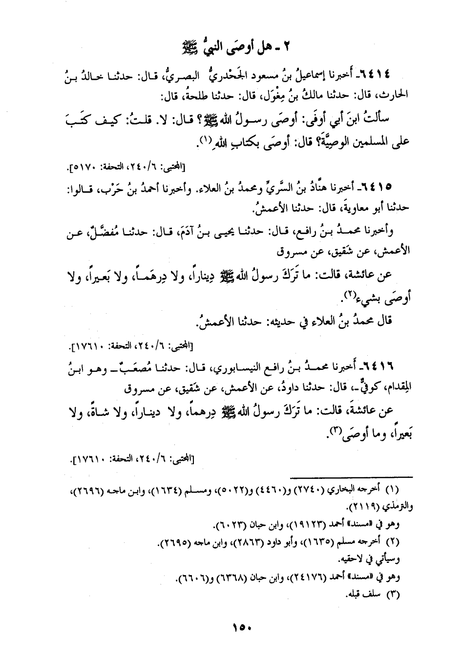 6415 - أَخْبَرَنَا هَنَّادُ بْنُ السَّرِيِّ، ومُحَمَّدُ بْنُ الْعَلَاءِ، وأَخْبَرَنَا أَحْمَدُ بْنُ حَرْبٍ، قَالُوا: حَدَّثَنَا أَبُو مُعَاوِيَةَ، قَالَ: حَدَّثَنَا الْأَعْمَشِ، وَأَخْبَرَنَا مُحَمَّدُ بْنُ رَافِعٍ، قَالَ: حَدَّثَنَا يَحْيَى بْنُ آدَمَ، قَالَ: حَدَّثَنَا مُفَضَّلٌ، عَنِ الْأَعْمَشِ، عَنْ شَقِيقٍ، عَنْ مَسْرُوقٍ، عَنْ عَائِشَةَ، قَالَتْ: «§مَا تَرَكَ رَسُولُ اللهِ صَلَّى اللهُ عَلَيْهِ وَسَلَّمَ دِينَارًا وَلَا دِرْهَمًا، وَلَا بَعِيرًا، وَلَا أُوصِي بِشَيْءٍ» قَالَ مُحَمَّدُ بْنُ الْعَلَاءِ فِي حَدِيثِهِ: حَدَّثَنَا الْأَعْمَشُ