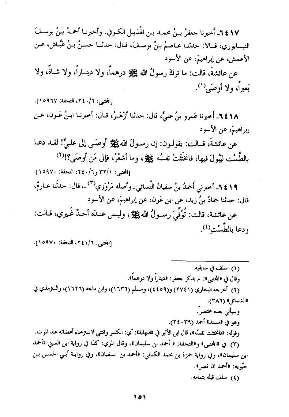 6417 - أَخْبَرَنَا جَعْفَرُ بْنُ مُحَمَّدِ بْنِ الْهُذَيْلِ الْكُوفِيُّ، وأَخْبَرَنَا أَحْمَدُ بْنُ يُوسُفَ النَّيْسَابُورِيُّ، قَالَا: حَدَّثَنَا عَاصِمُ بْنُ يُوسُفَ، قَالَ: حَدَّثَنَا حَسَنُ بْنُ عَيَّاشٍ، عَنِ الْأَعْمَشِ، عَنْ إِبْرَاهِيمَ، عَنِ الْأَسْوَدِ، عَنْ عَائِشَةَ، قَالَتْ: §مَا تَرَكَ رَسُولُ اللهِ صَلَّى اللهُ عَلَيْهِ وَسَلَّمَ دِرْهَمًا وَلَا دِينَارًا، وَلَا شَاةً وَلَا بَعِيرًا، وَلَا أَوْصَى "