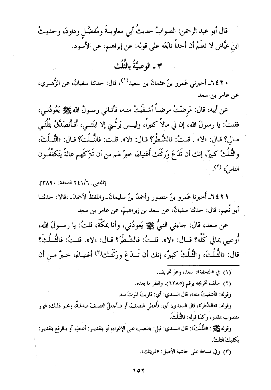 6421 - أَخْبَرَنَا عَمْرُو بْنُ مَنْصُورٍ، وَأَحْمَدُ بْنُ سُلَيْمَانَ وَاللَّفْظُ لِأَحْمَدَ، قَالَا: حَدَّثَنَا أَبُو نُعَيْمٍ، قَالَ: حَدَّثَنَا سُفْيَانُ، عَنْ سَعْدِ بْنِ إِبْرَاهِيمَ، عَنْ عَامِرِ بْنِ سَعْدٍ، عَنْ سَعْدٍ، قَالَ: جَاءَنِي النَّبِيُّ صَلَّى اللهُ عَلَيْهِ وَسَلَّمَ يَعُودُنِي وَأنا بِمَكَّةَ، قُلْتُ: يَا رَسُولَ اللهِ، أُوصِي بِمَالِي كُلَّهِ؟، قَالَ: «لَا»، قُلْتُ: فَالشَّطْرُ؟، قَالَ: «لَا»، قُلْتُ: فَالثُّلُثُ؟، قَالَ: «§الثُّلُثُ، وَالثُّلُثُ كَبِيرٌ، إِنَّكَ أَنْ تَدَعَ وَرَثَتَكَ أَغْنِيَاءَ خَيْرٌ مِنْ أَنْ تَدَعَهُمْ عَالَةً يَتَكَفَّفُونَ النَّاسَ، يَتَكَفَّفُونَ فِي أَيْدِيهِمْ»